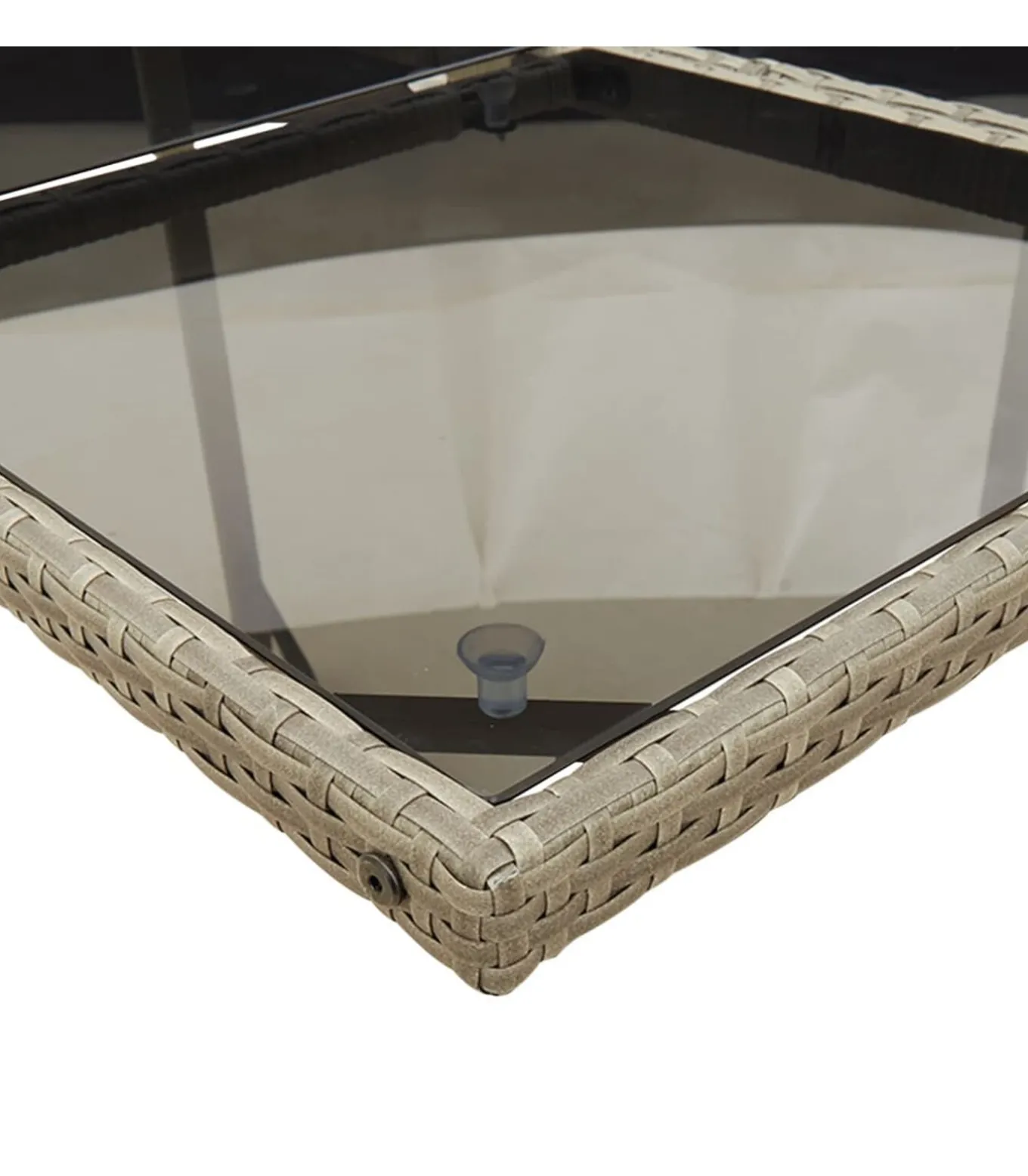 Glazen tafelblad: het blad van de tuintafel is gemaakt van sterk en duurzaam gehard glas, waardoor het gemakkelijk schoon te maken is met een vochtige doek. Het voegt ook een vleugje elegantie toe aan je buitenruimte.