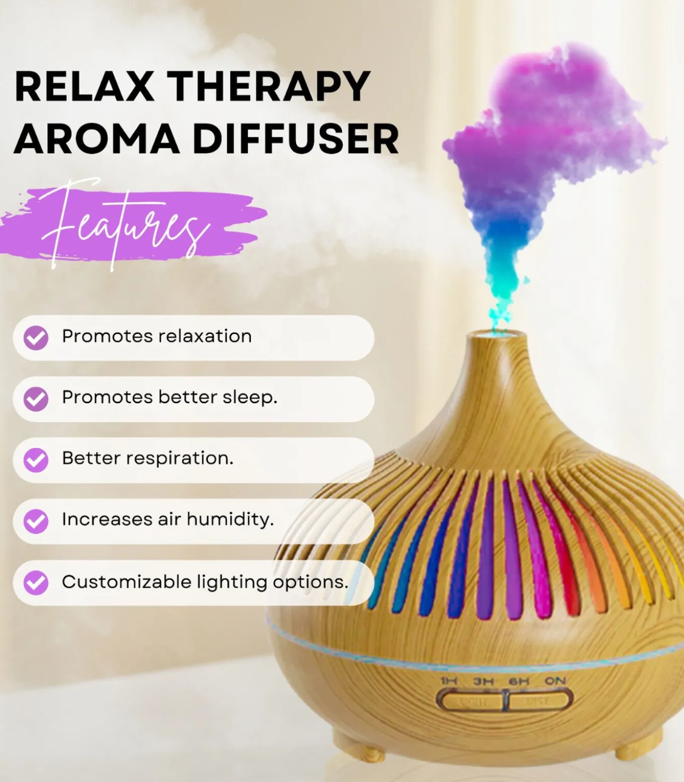 Ultrasoon technologie: Stil en fijne mist.7–kleurige LED–verlichting: Creëer een ontspannen sfeer met aanpasbare verlichtingsopties.Timerfunctie: Kies uit 1, 3 of 6 uur instellingen voor automatisch uitschakelen.Groot waterreservoir: Tot 300 ml capaciteit voor langdurig gebruik.Automatische uitschakeling: voorkomt oververhitting en zorgt voor veiligheid.Voordelen:Verbeterde luchtkwaliteit: Bevochtigt de lucht en helpt droogheid en irritatie te verminderen.Bevordert ontspanning: Creëert een kalmerende en rustgevende omgeving met essentiële oliën.Aromatherapie voordelen: Verbetert de stemming, vermindert stress en verbetert de slaapkwaliteit.Gebruiksvriendelijk: Eenvoudige bediening met één knop.Stijlvol design: Voegt een vleugje elegantie toe aan elke ruimte.Aanvullende informatie:Stroombron: USB–aangedrevenDe Aroma Diffuser Relax Therapie is een geweldige manier om je thuisomgeving te verbeteren en ontspanning te bevorderen. Het is gemakkelijk te gebruiken, stil en effectief. Probeer het vandaag nog en ervaar de voordelen van aromatherapie!