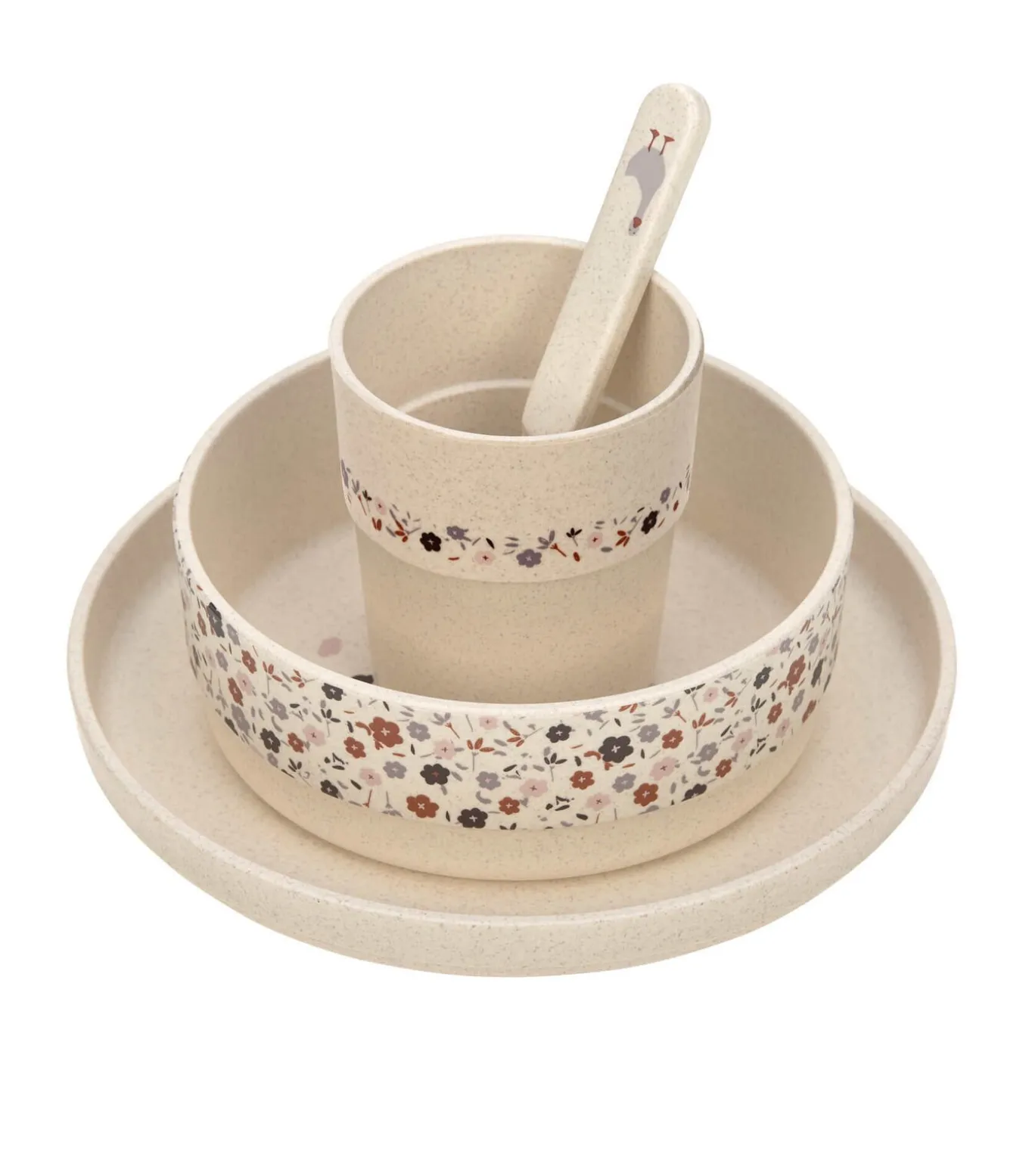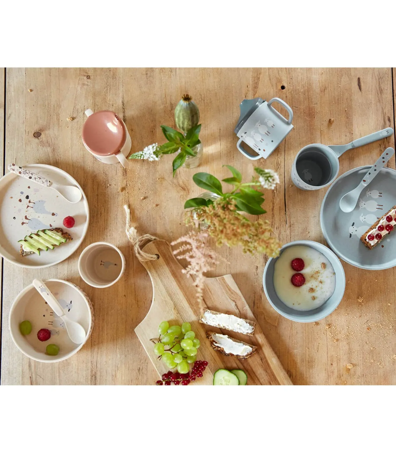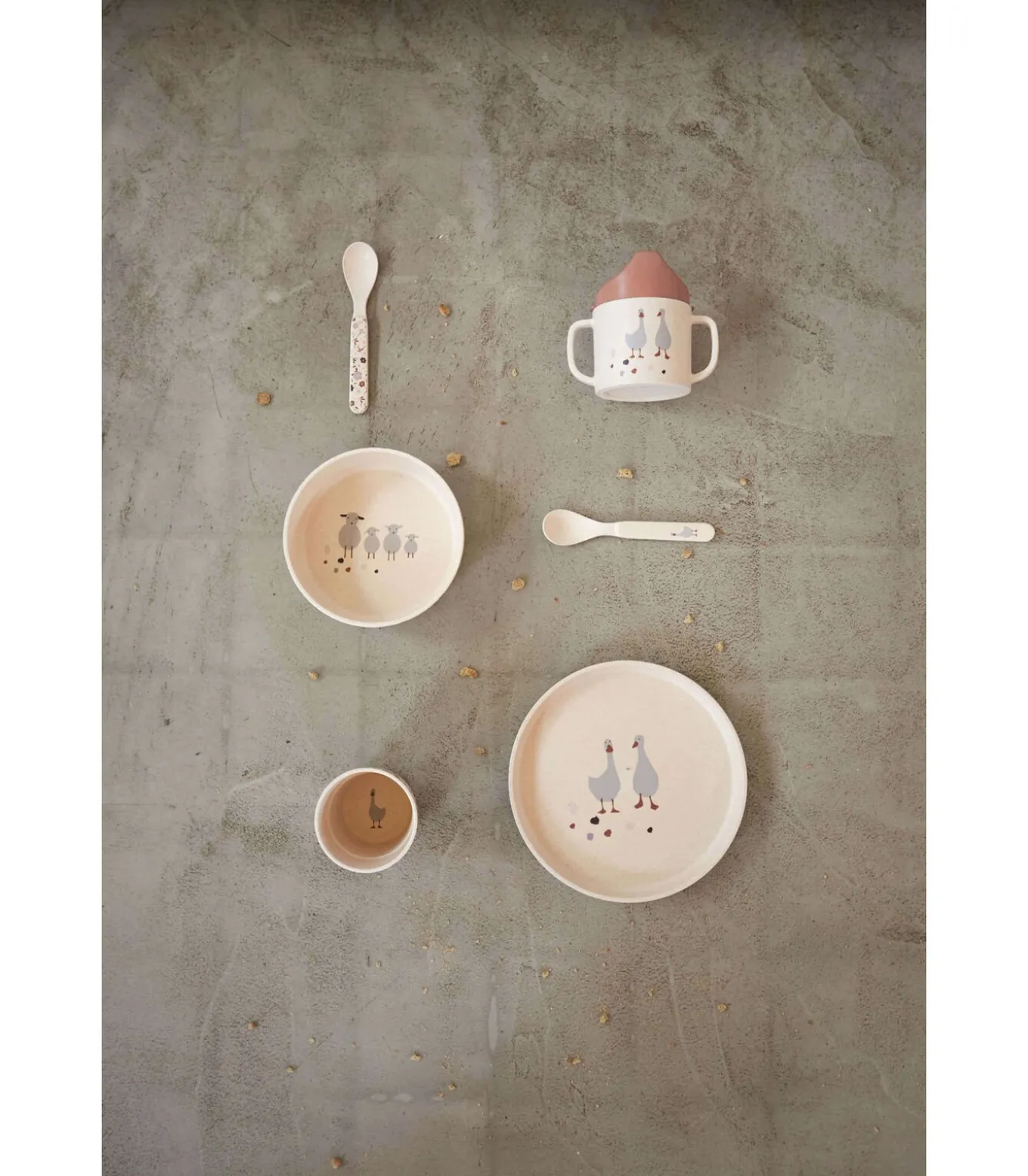 De Tiny Farmer maaltijdset met zachte schapen en waggelende ganzen nodigt kleine fijnproevers uit om aan tafel kennis te maken met de natuur.De set bestaat uit een bord, kom, beker en lepel. De set bestaat uit een bord, kom, beker en lepel, en een antislip siliconen ring aan de onderkant om ervoor te zorgen dat het servies op zijn plaats blijft.Het kinderservies is BPA–vrij, zeer licht en vaatwasmachine– en magnetronbestendig. Het is gemaakt van een mengsel van polypropyleen en cellulose, zodat het duurzamer is en bij de productie ervan zuiniger met hulpbronnen omgaat dan conventioneel polypropyleen. Het bord, de kom, de beker, de lepel en de oefenbeker met twee handvatten en een tuit zijn afzonderlijk verkrijgbaar.