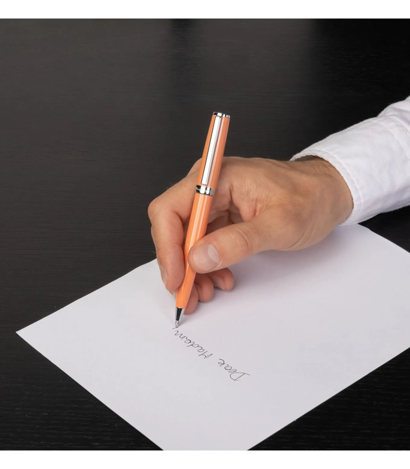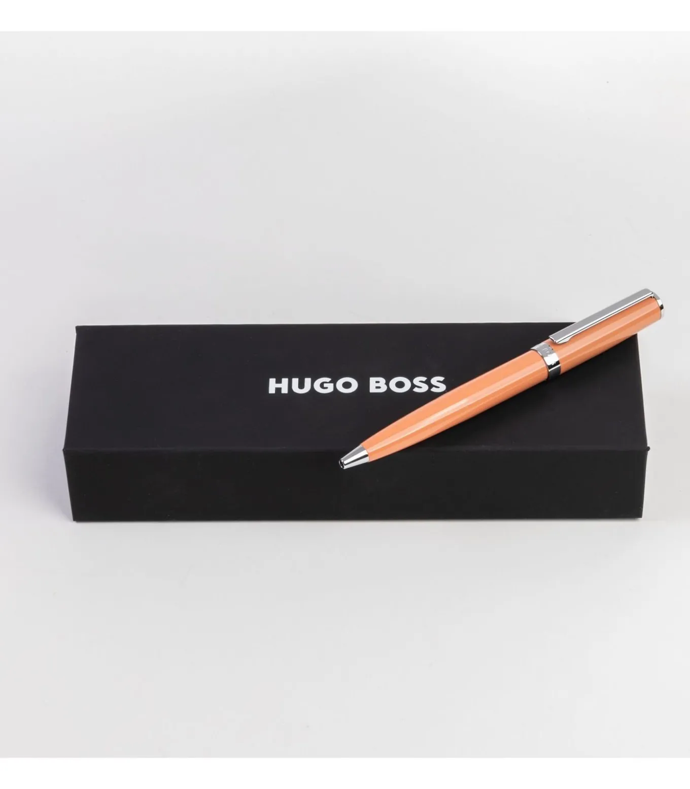 De allernieuwste versie van de iconische Gear balpen van Hugo Boss. Het bekende silhouet met een tijdloze twist, voorzien van een simplistische logo ring met glanzende lak. Het perfect gebalanceerde systeem zorgt voor een ultieme schrijfervaring. De pen wordt geleverd in een luxe design geschenkbox en is verkrijgbaar in vele verschillende kleuren, zowel neutrale, als ook in trendy zachte pasteltinten zoals deze lichtoranje versie. Dimensions: DIA.12/H.136 mm, Material: Brass,Metallic paint (matt),Metallic paint (shiny),Chrome plating