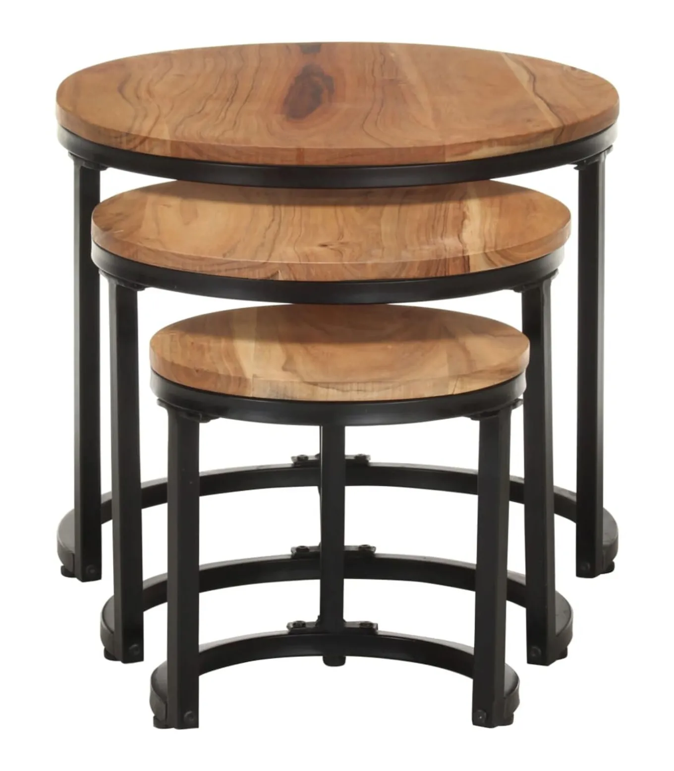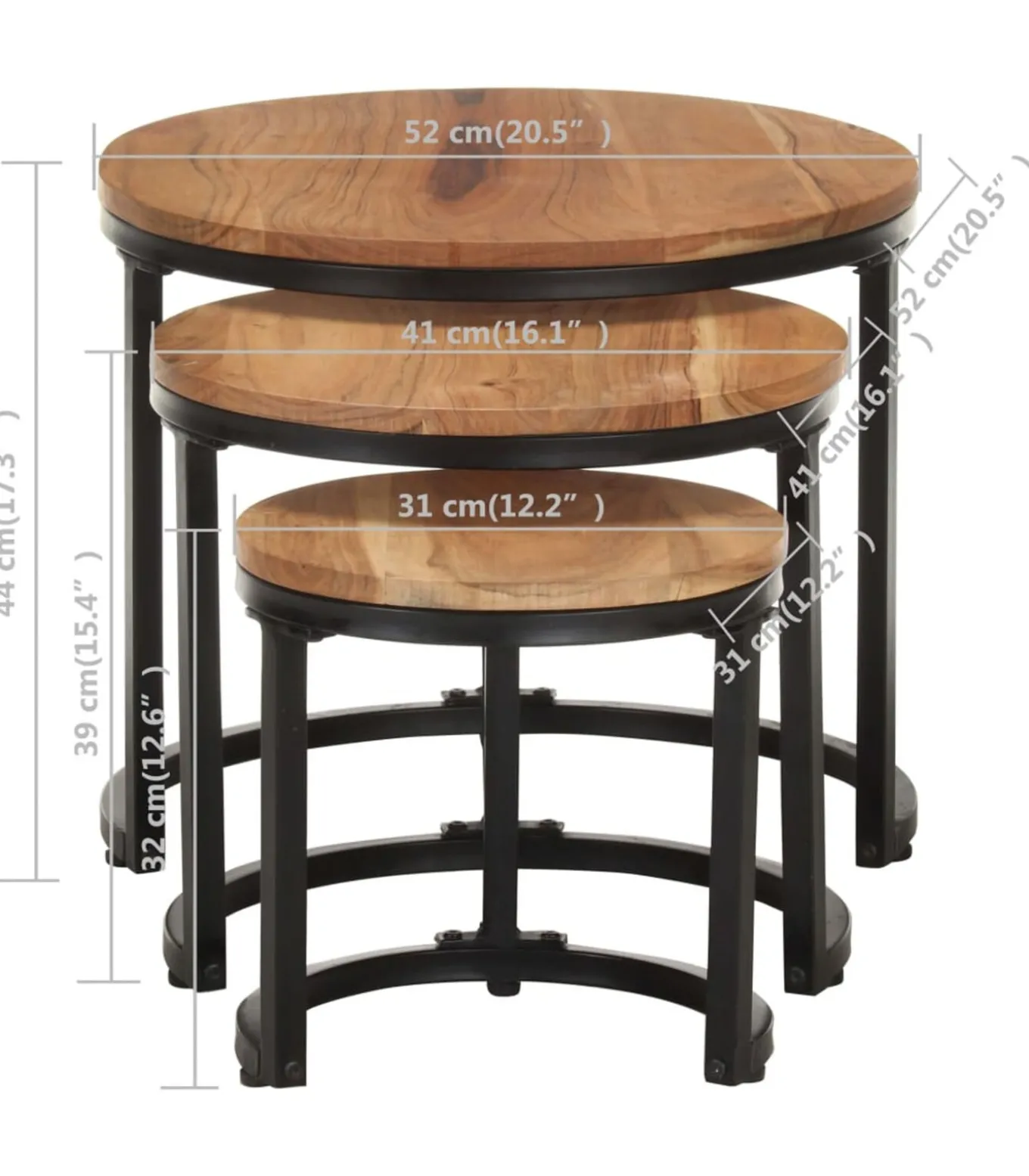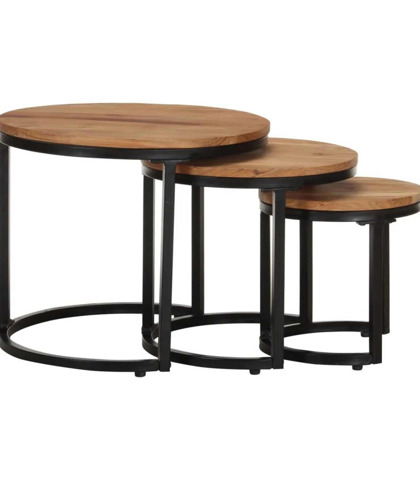 Deze tafelset is gemaakt van massief acaciahout en is zeer stevig. Het voortreffelijke vakmanschap en de prachtige houtnerven maken elk stuk net iets anders dan de rest. Daarnaast zorgt het massieve tafelblad voor een stabiel en veilig oppervlak waarop u uw verschillende benodigdheden kunt plaatsen. Het massieve tafelblad biedt een stabiel en stevig oppervlak waarop je verschillende spullen kunt plaatsen. De gepoedercoat ijzeren basis draagt bij aan de stevigheid en stabiliteit. Je kan de tafeltjes samen of apart gebruiken en in elkaar opbergen om ruimte te besparen.