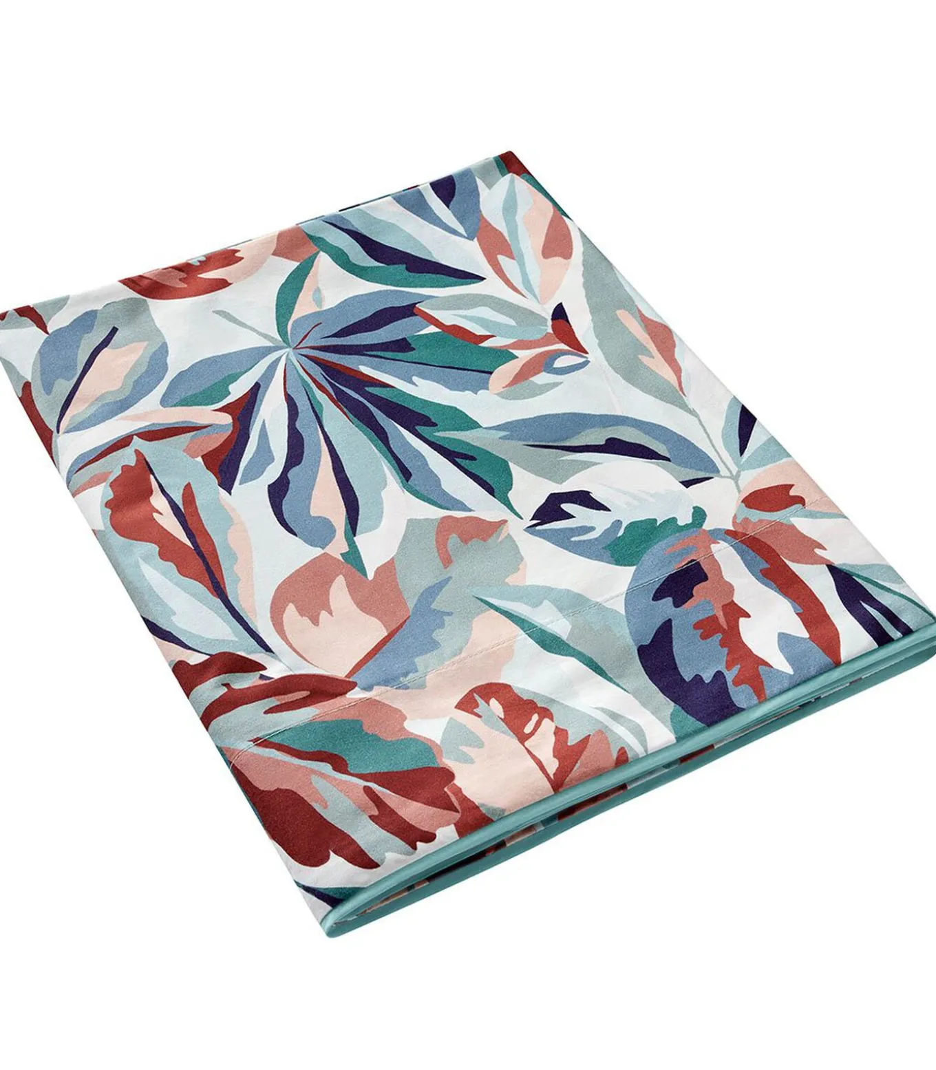Meerkleurige exotische bladerenprintBies van 8 cm.Afwerking met groene bies.