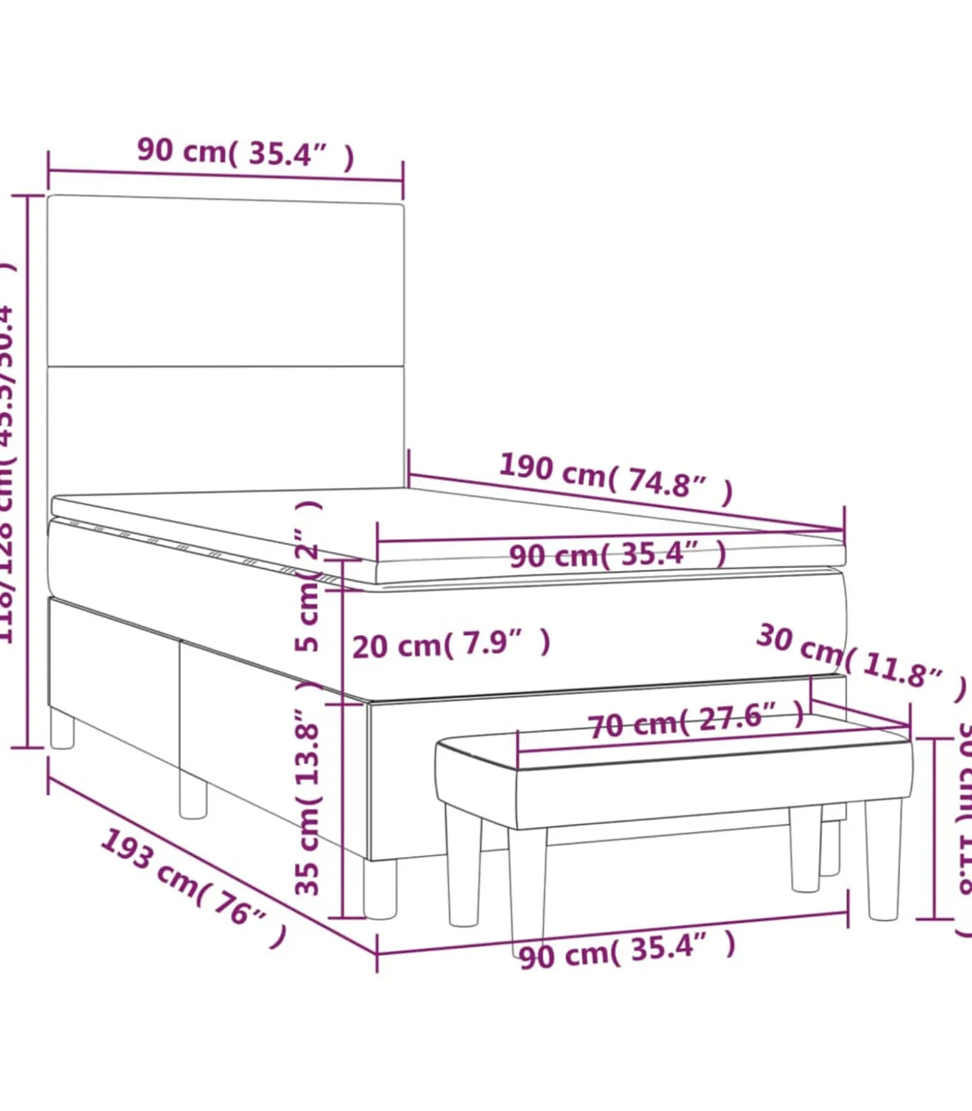 Totale afmetingen: 193 x 90 x 118/128 cm (L x B x H)