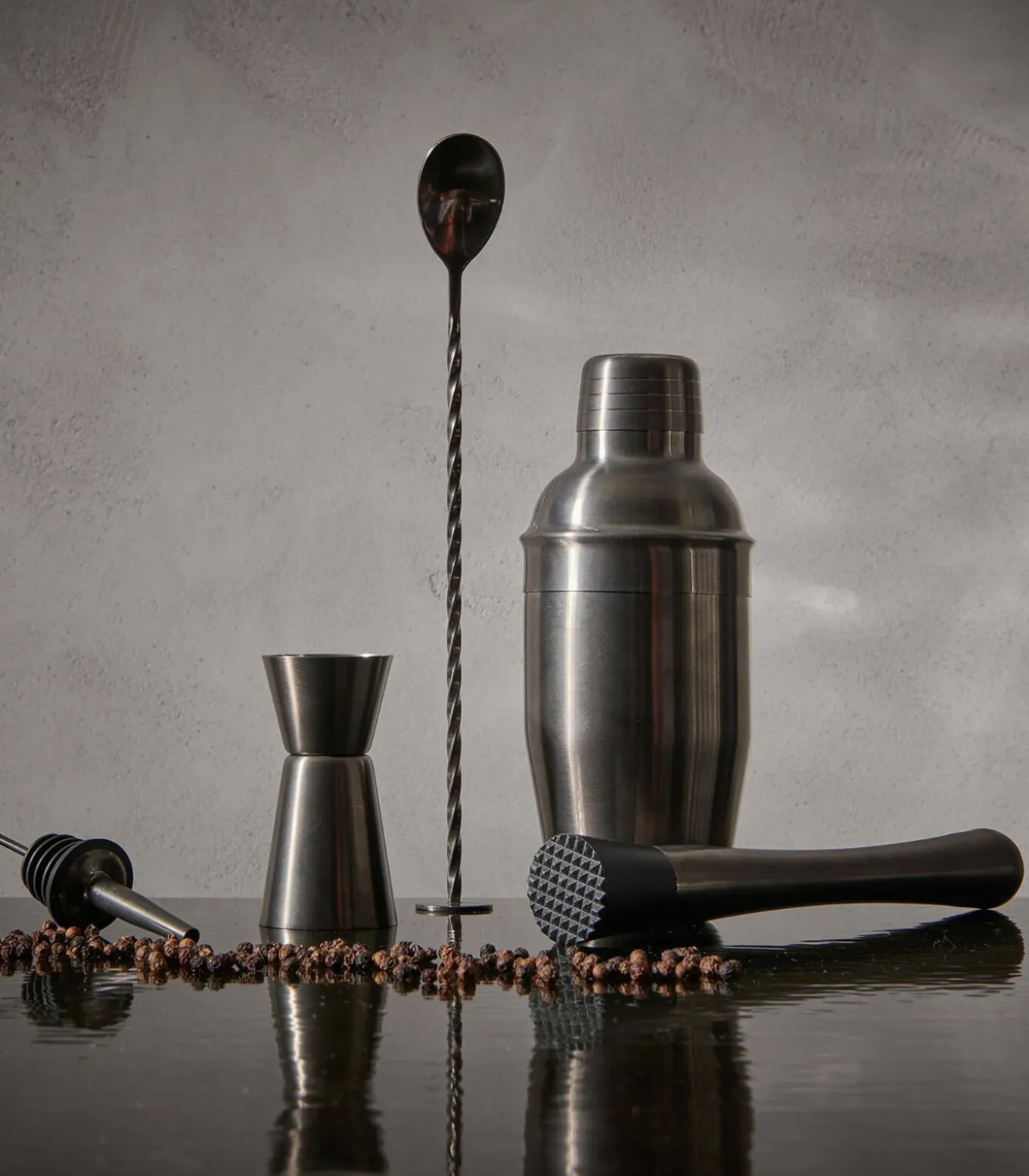Het verfijnde assortiment glaswerk van “Bar” is het perfecte cadeau voor de cocktailmixoloog. “Bar” biedt u gesneden glazen karaffen en glassets met trendy patronen en texturen, samen met een bar set in roestvrij staal om entertainen nóg leuker te maken. Deze 7–delige set bestaat uit 1 cocktailshaker, 1 cocktaillepel, 1 maat voor cocktails 2.5/5cl, 1 cocktailstamper en 3 shenktuitjes
