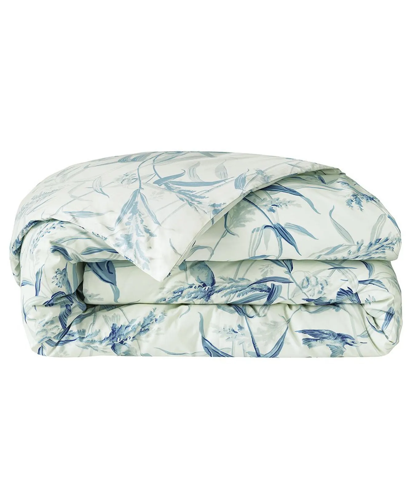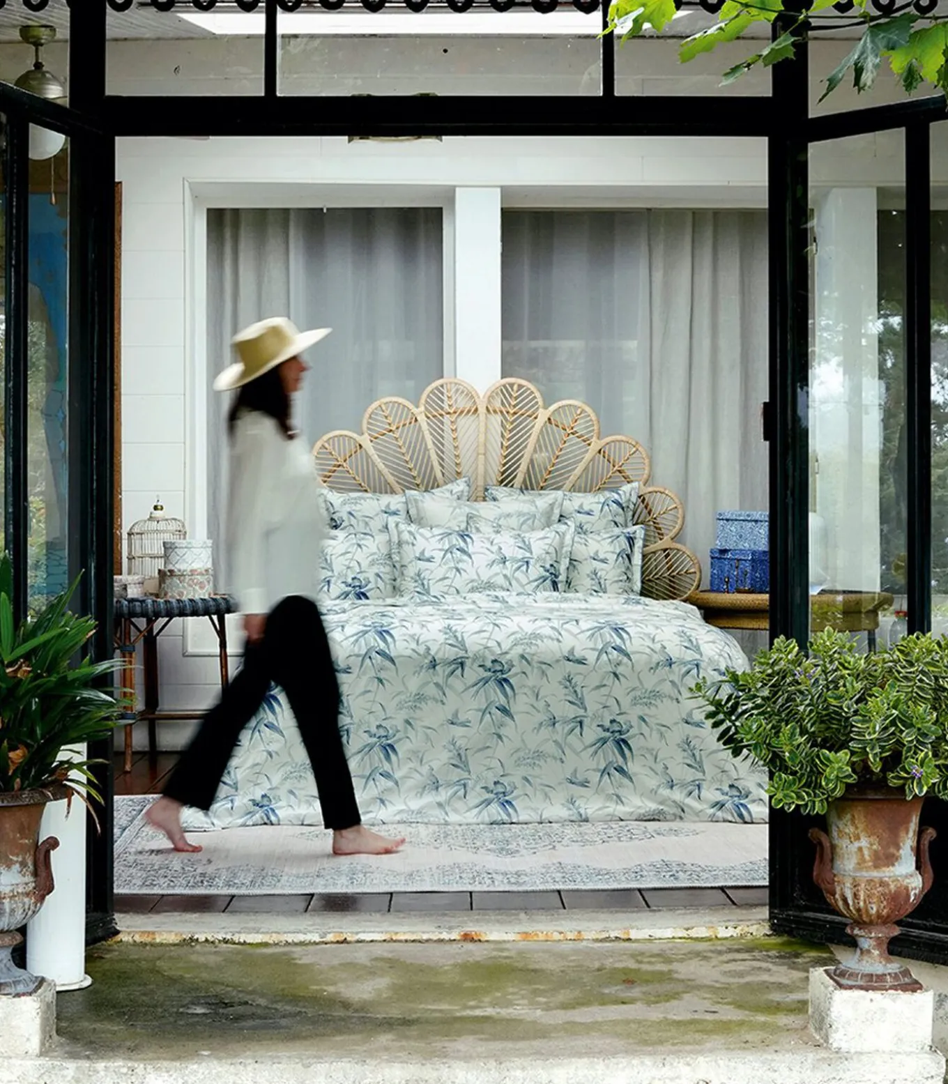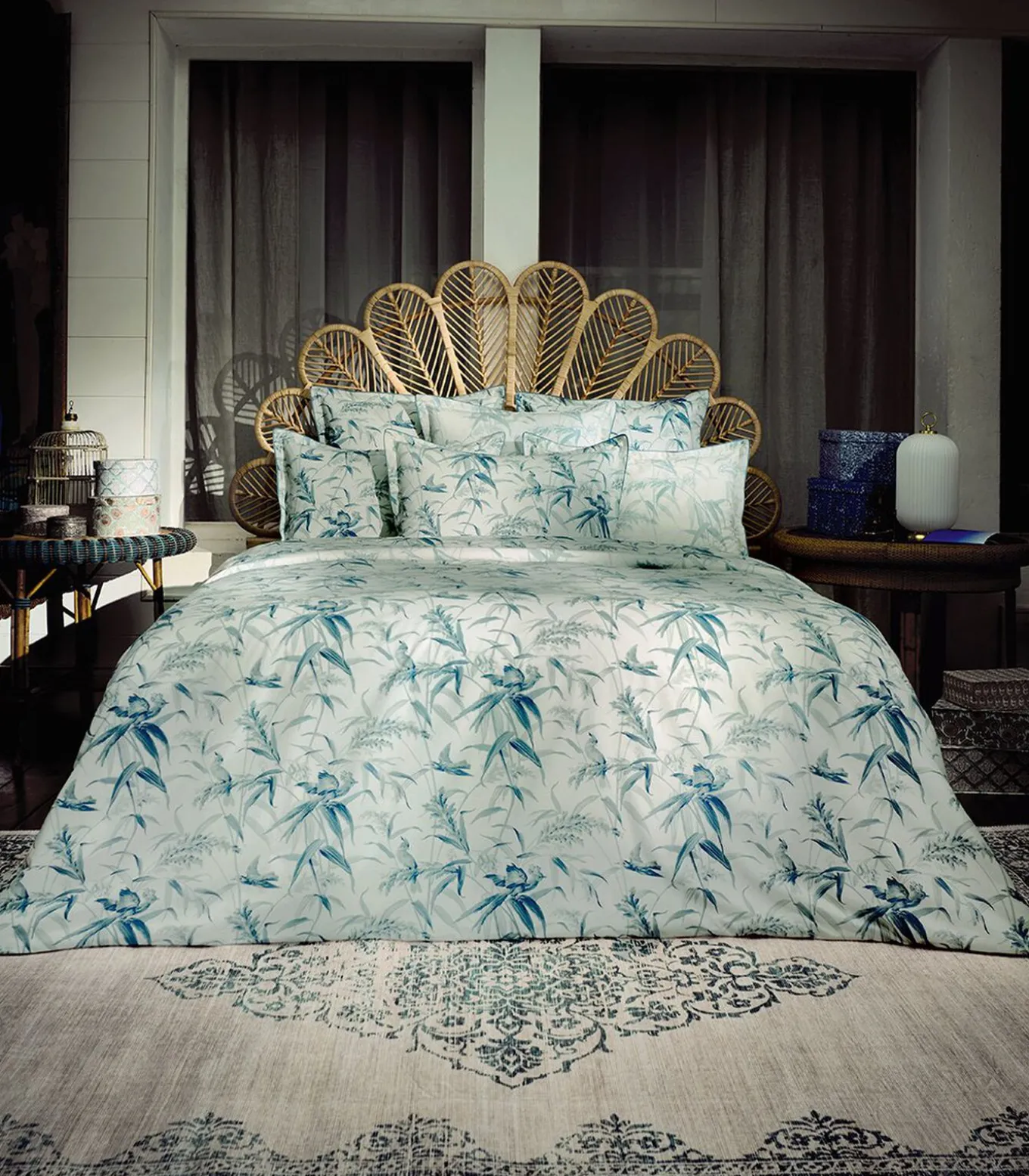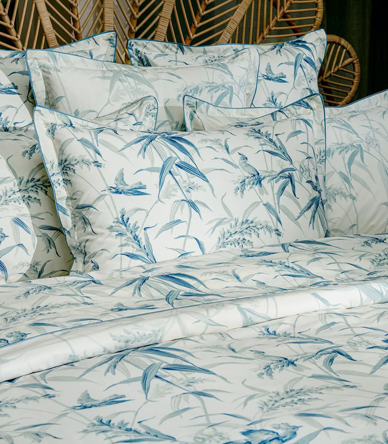 Bedrukking van blauwe planten en parkieten op een ivoorkleurige achtergrond.Keerzijde bedrukt met blauwe planten op een ivoorkleurige achtergrond.Afgewerkt met een flessluiting.