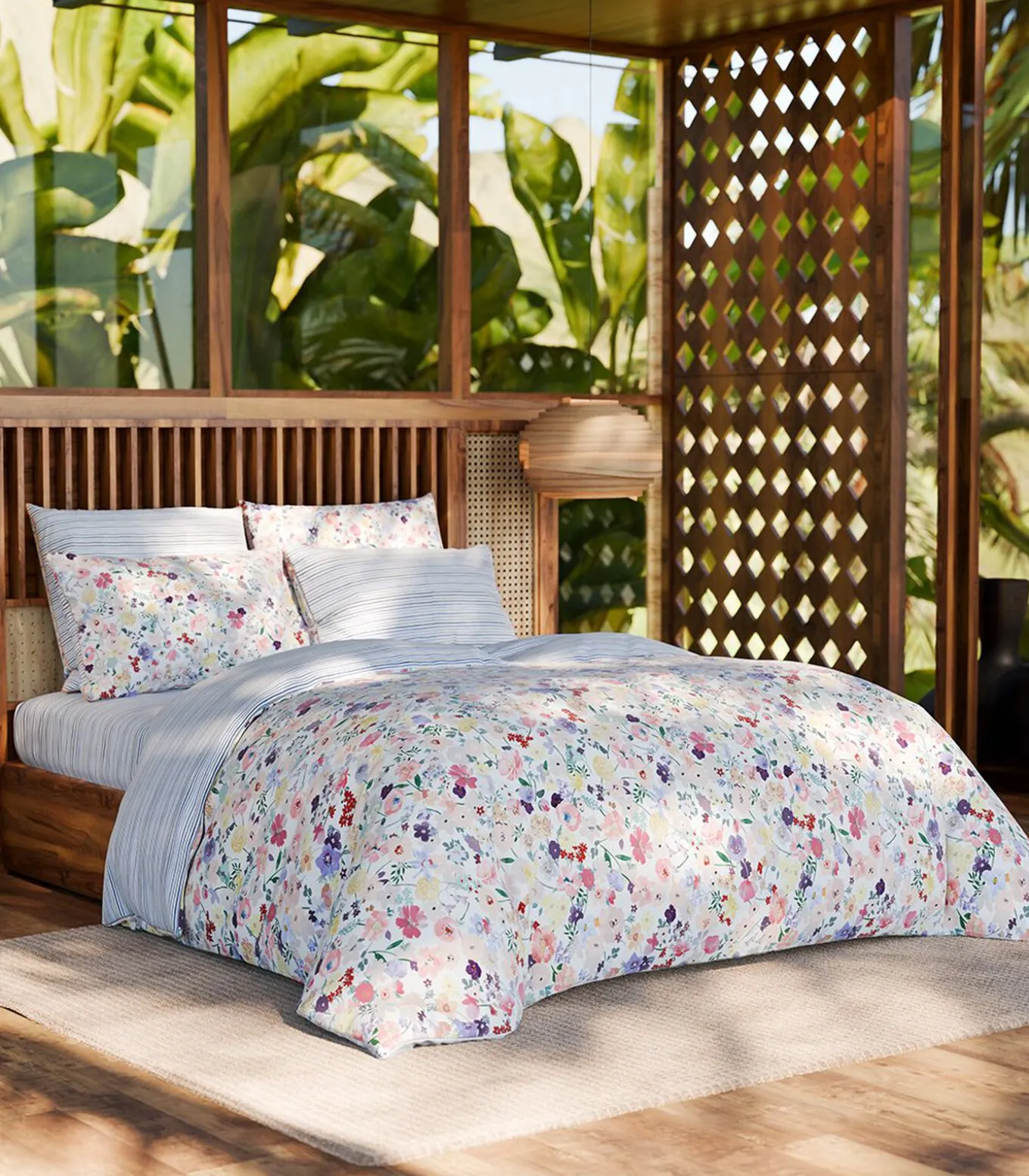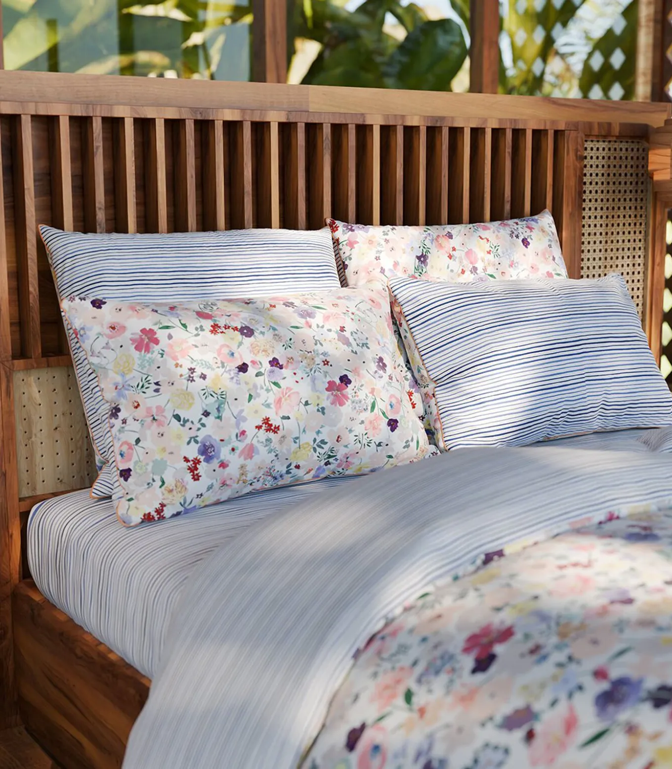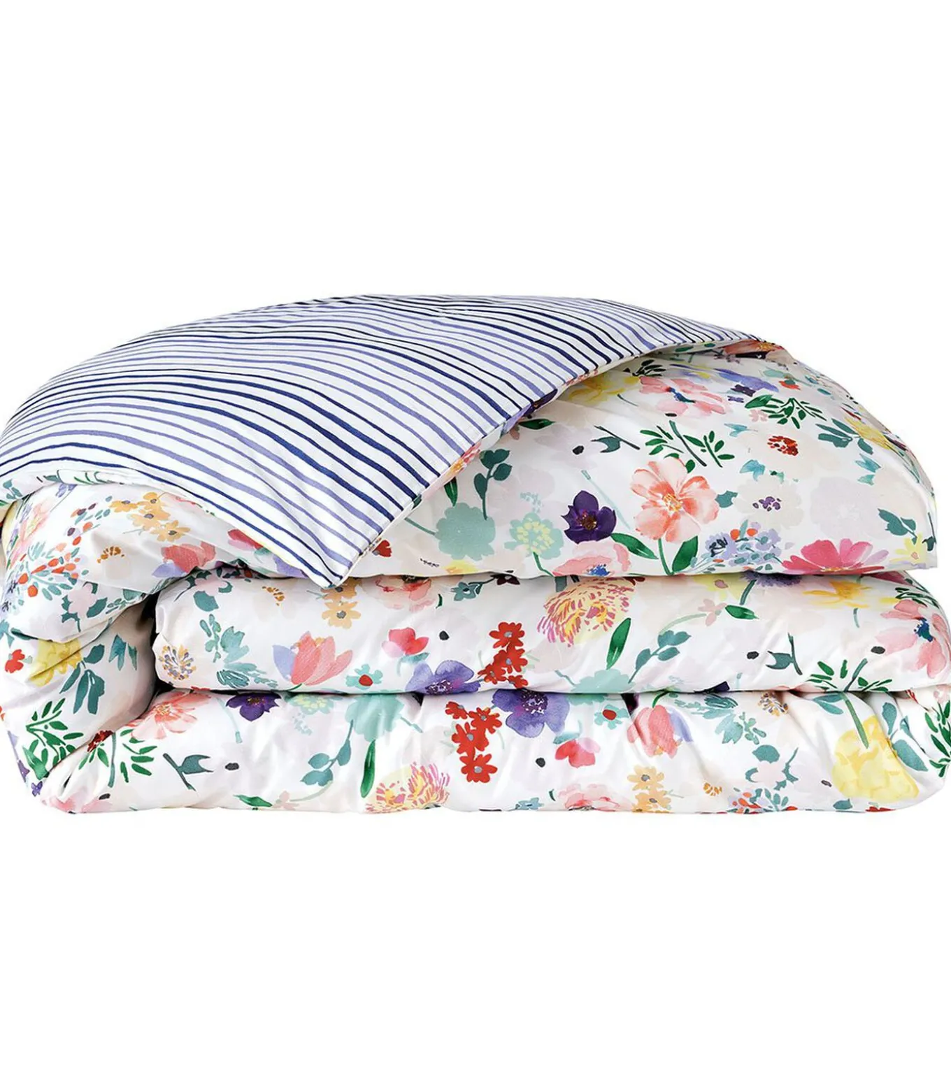 Meerkleurige bloemenprintAchterkant met maritieme streepprint.Afwerking met flessenhals