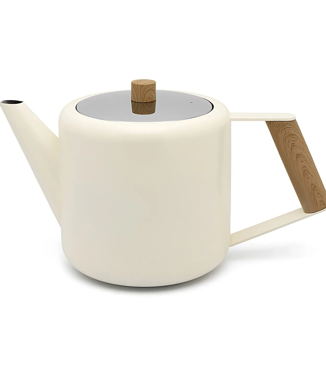 De Boston theepot dankt zijn moderne uitstraling aan de combinatie van het mat witte RVS, de glanzende deksel en het handvat en dopje met houten look. Een echte eyecatcher op de keukentafel! Boston is gemaakt van hoogwaardig metaal en heeft een dubbele isolerende wand. Daardoor blijft thee wel drie kwartier tot een uur lang warm en op smaak (indien de theepot minimaal tot 90% gevuld is). De speciaal vormgegeven tuit zorgt ervoor dat de theepot optimaal en zonder te druppelen schenkt. Dankzij het metaal van hoogwaardige kwaliteit gaat de theepot jaren mee. De pot heeft een inhoud van 1,1 liter wat gelijk staat aan 5 koppen thee.