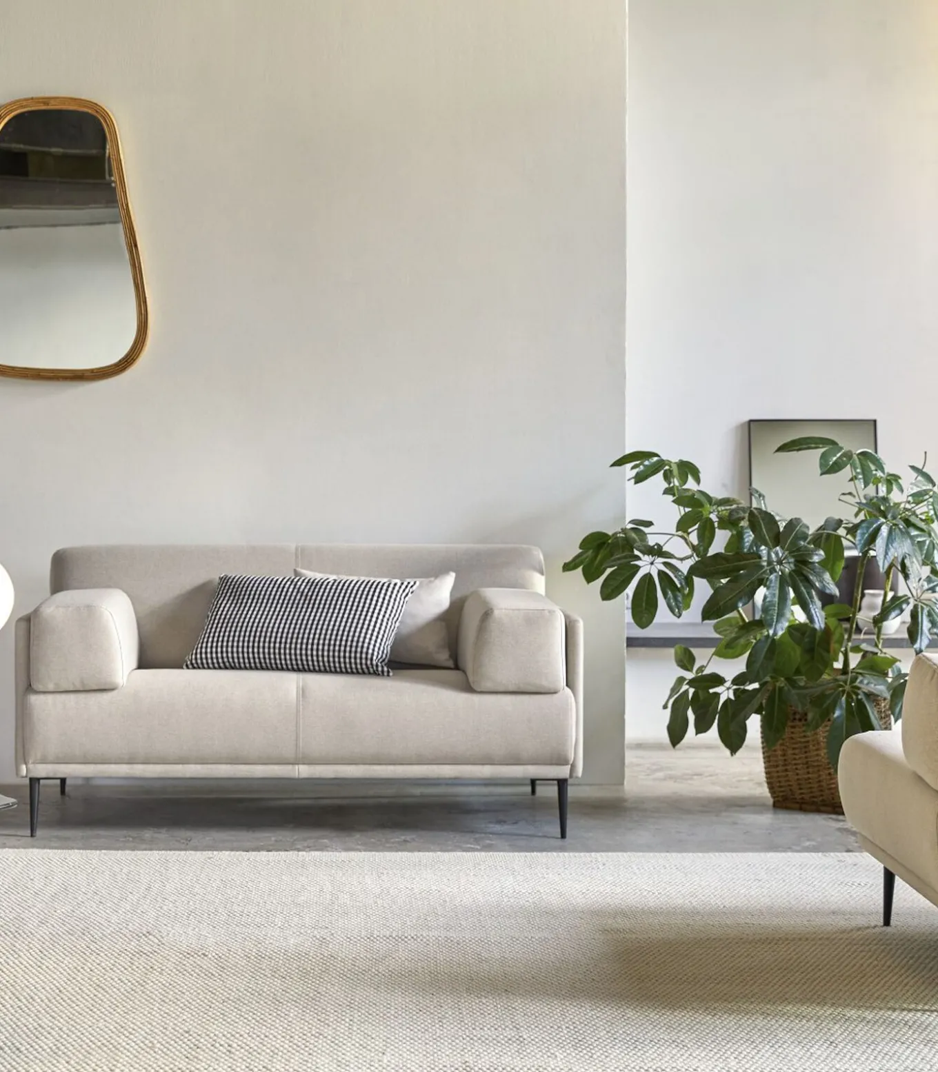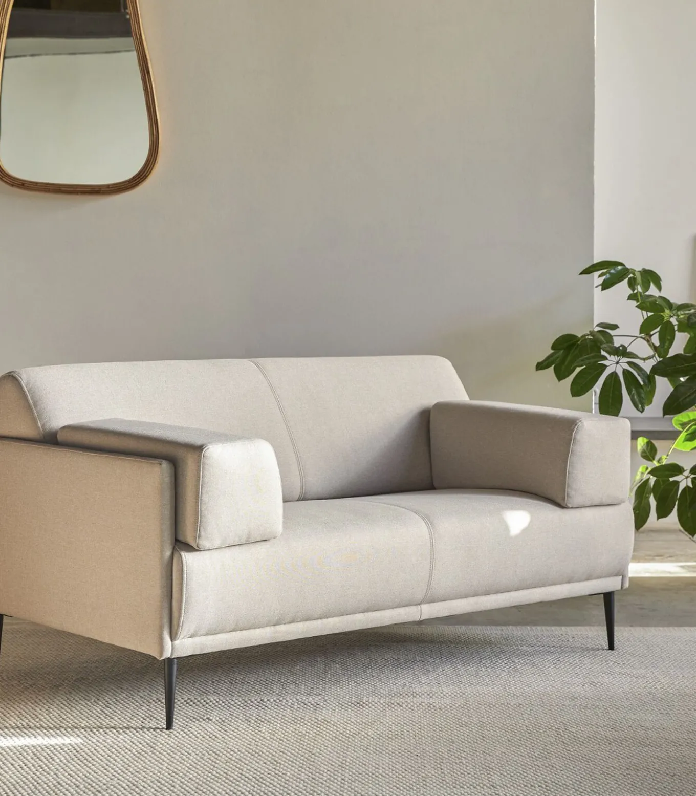 De stoffen bank Finn, het middelpunt van uw woonkamer, heeft elegante, strakke lijnen en een lichte kleur die gemakkelijk te combineren is met uw bestaande inrichting. De brede armkussens zijn afneembaar, dat is heel handig, want zo kunt u spelen met twee looks bij dezelfde bank! Deze comfortabele bank is bekleed met OEKO–TEX® gecertificeerde stof, wat garandeert dat hij geen schadelijke chemicaliën bevat, en hij heeft aantrekkelijke metalen poten die hoog genoeg zijn om er met een bezem onderdoor te vegen. Naar uw wens of behoefte kunt u overwegen om het te verfraaien met een van de kussens of kussens die we aanbieden.