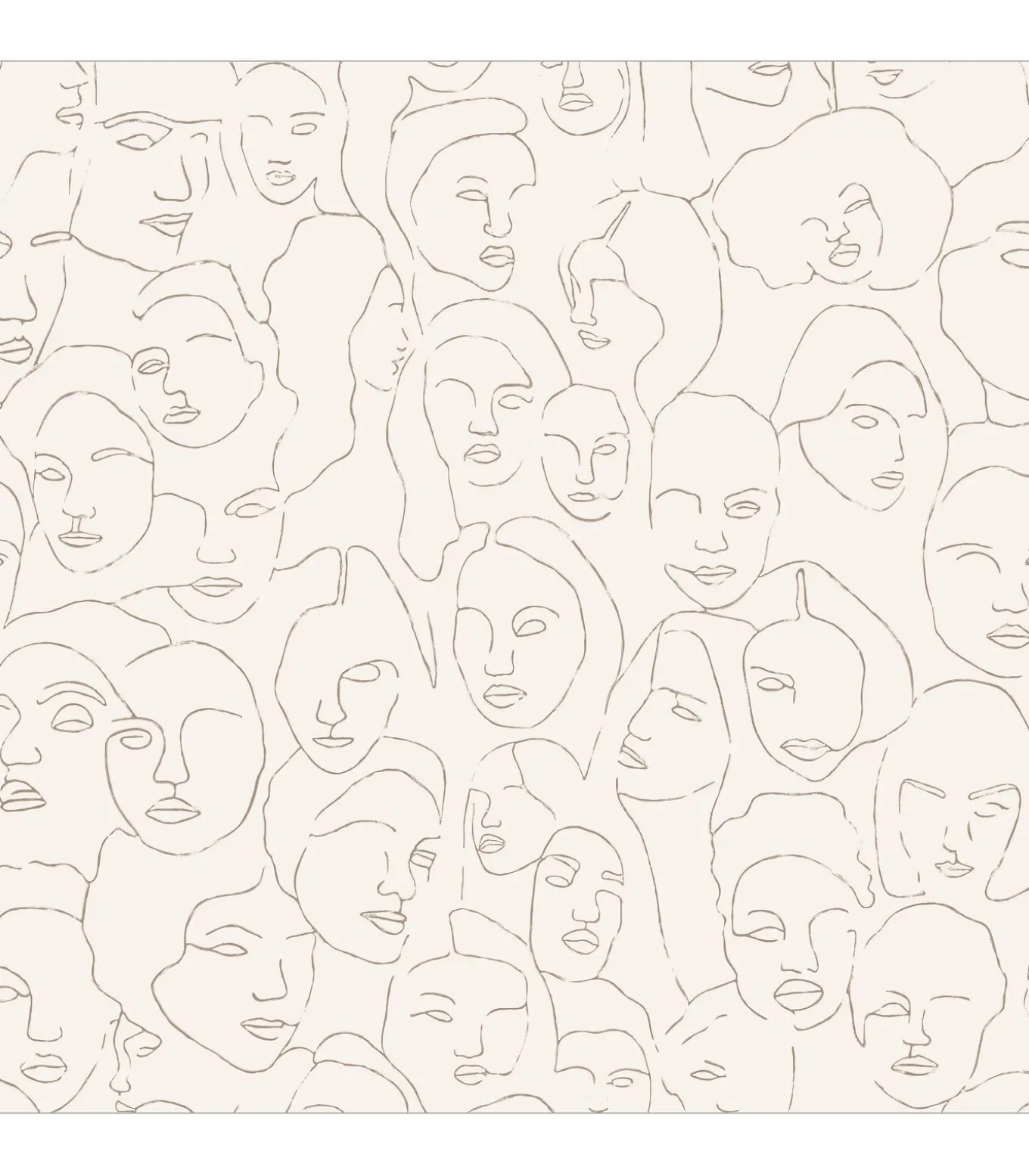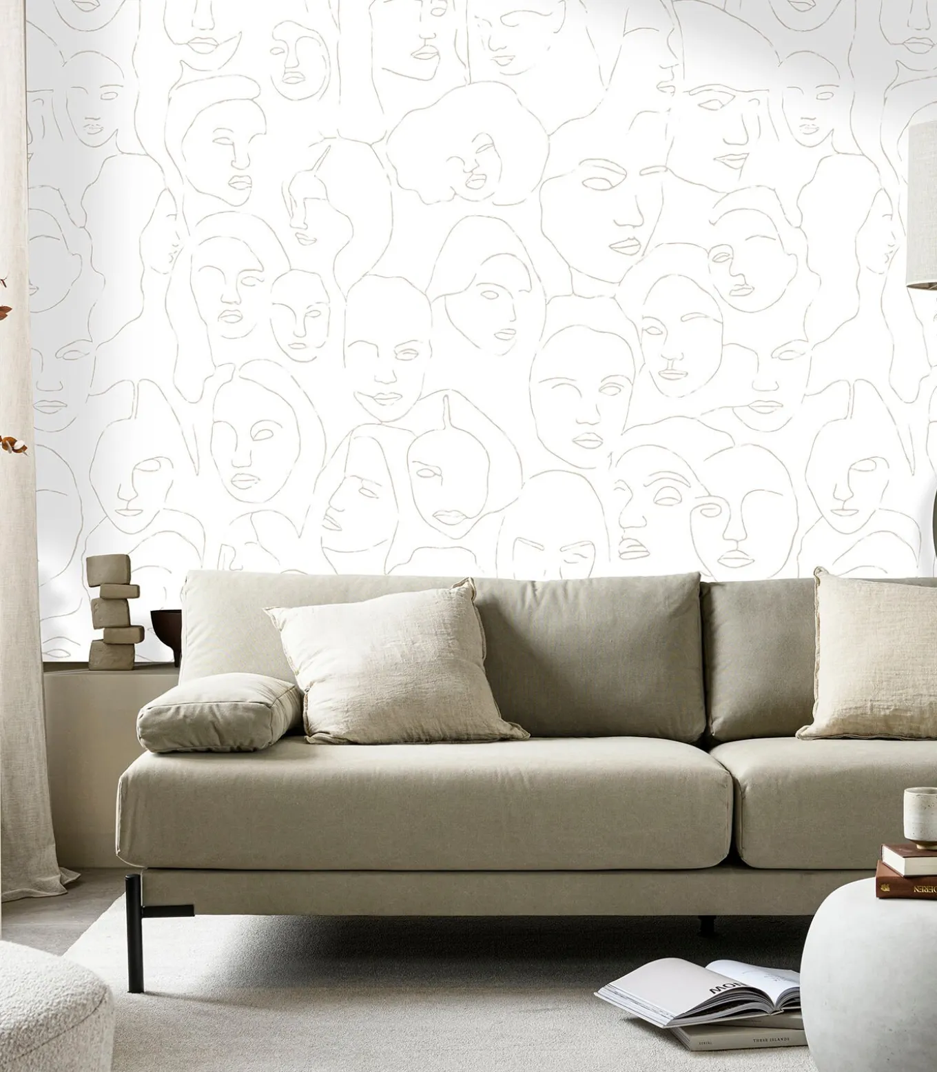 Het behang is voorzien van een patroon van abstracte lijntekeningen die de contouren van diverse vrouwengezichten vormen. De gracieuze lijnen vloeien moeiteloos en de zachte beige schetsen op de heldere witte achtergrond dragen bij aan een gevoel van sereniteit en warmte in elke ruimte.