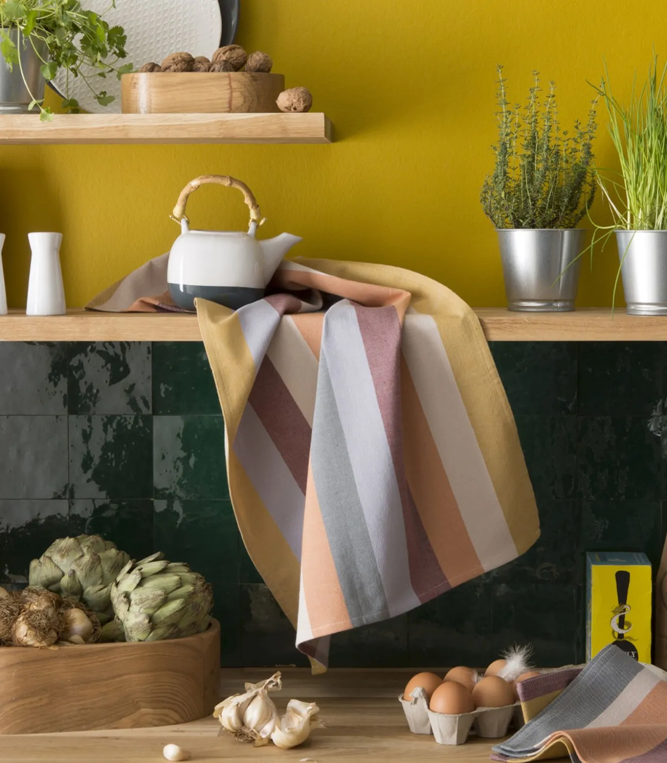 De theedoek Gaspard in katoenen jacquard brengt met zijn kleurenspel een vleugje originaliteit in je keuken