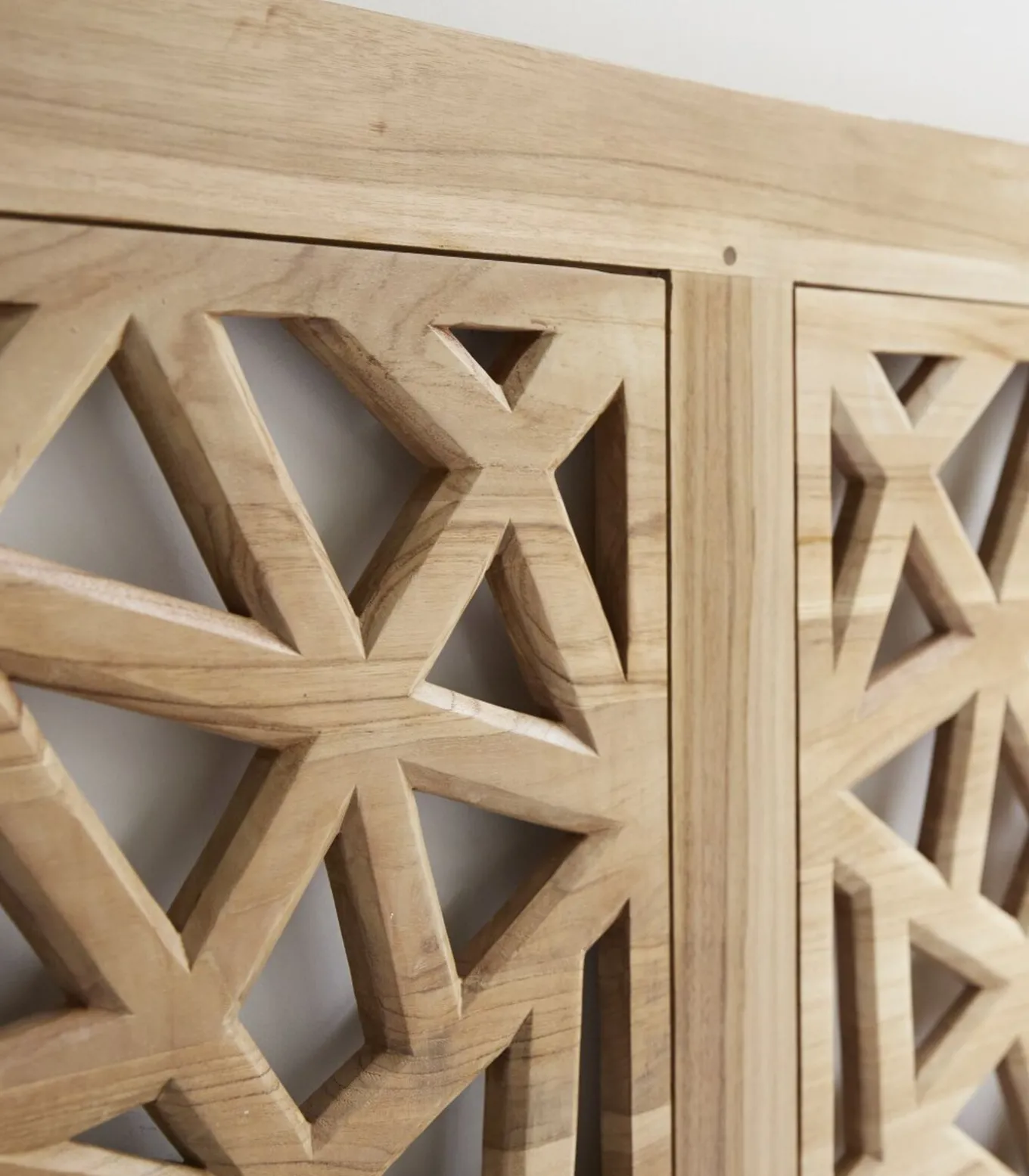 Bijna een kunstwerk: elk stuk is uniek! Het Gentong massief teakhouten hoofdbord is volledig met de hand gesneden door ambachtslieden met uitzonderlijke vaardigheden. Gemaakt van een natuurlijk nobel en robuust hout en geïnspireerd door verre horizonten om hét decoratiestuk van de slaapkamer te worden. Dit prachtige hoofdbord waakt elke dag over u tijdens het inslapen en weer wakker worden. Gemakkelijk te installeren in elke slaapkamer en de lichte kleur laat allerlei stijlcombinaties toe…