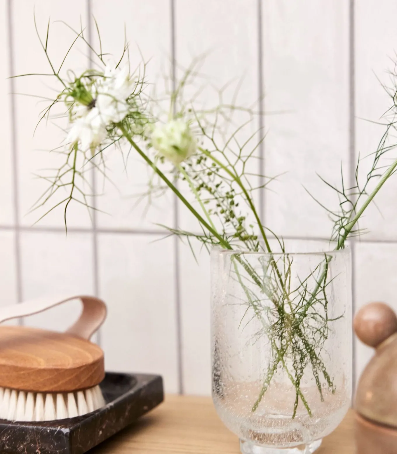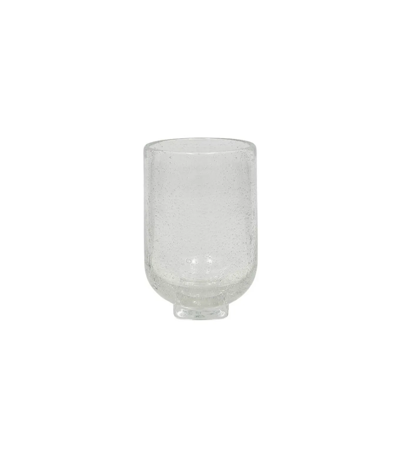 De glazen Kuki Hurricane heeft bubbels die een vleugje eigenzinnigheid toevoegen aan het minimalistische ontwerp. De stevige basis voegt een speels element toe aan de tijdloze esthetiek en combineert functionaliteit met elegantie. Perfect voor kaarsen of als decoratie. Omdat hij met de mond geblazen is, varieert elke orkaan in grootte, wat bijdraagt aan zijn unieke charme.