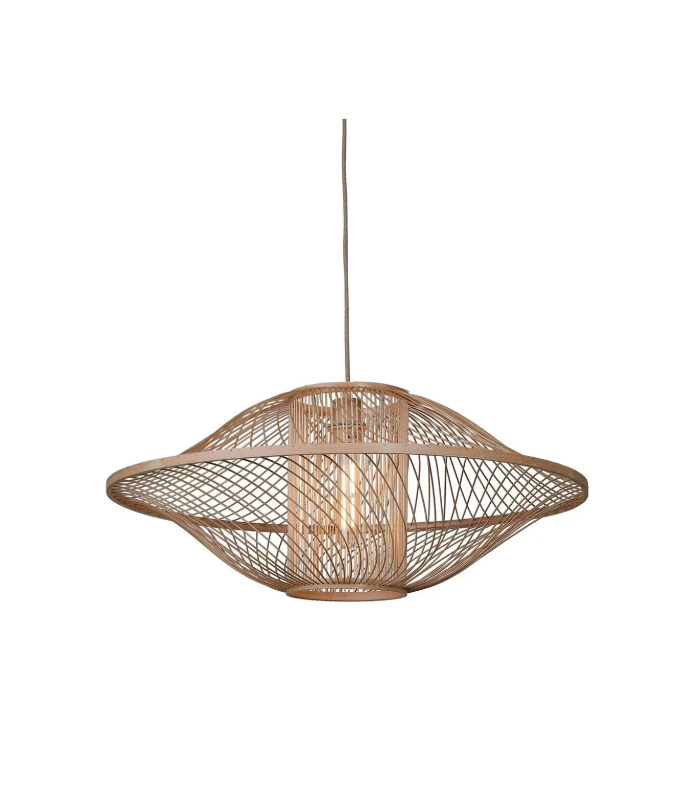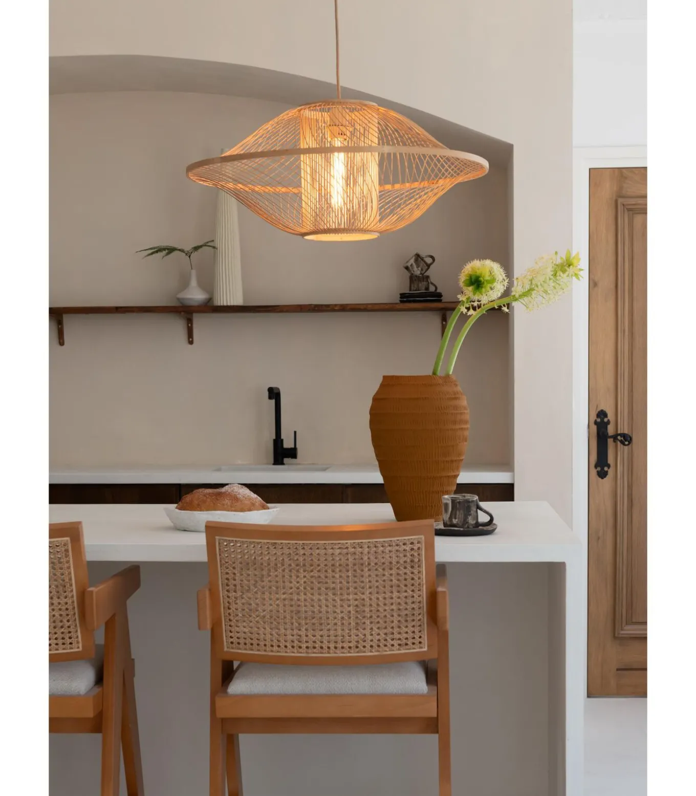 Hanglamp Maui naturel brengt de tropische charme van het eiland Maui in huis. Met zijn handgemaakte ontwerp van ronde bamboelatjes in een verfijnde spiegelstructuur, roept deze lamp de vloeiende kustlijnen en weelderige natuur van Maui op. De naturel kleur voegt warmte en diepte toe, terwijl het bamboe zorgt voor een authentieke, organische uitstraling. Of de plafondlamp nu boven de eettafel hangt of een knus hoekje verlicht, hanglamp Maui straalt een onweerstaanbare mix van elegantie en tropische flair uit. Perfect om elke ruimte een stijlvolle, warme sfeer te geven. Eenvoudig te monteren met het bijgeleverde plafondsysteem.