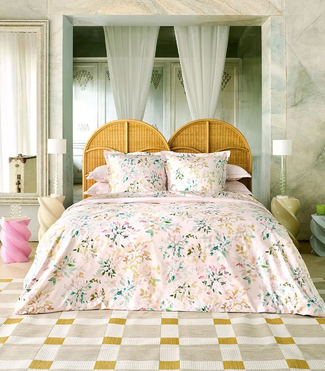 Bedrukking van ruitjes op een lichtroze achtergrond.Hoeslaken met een hoogte van 35 cm