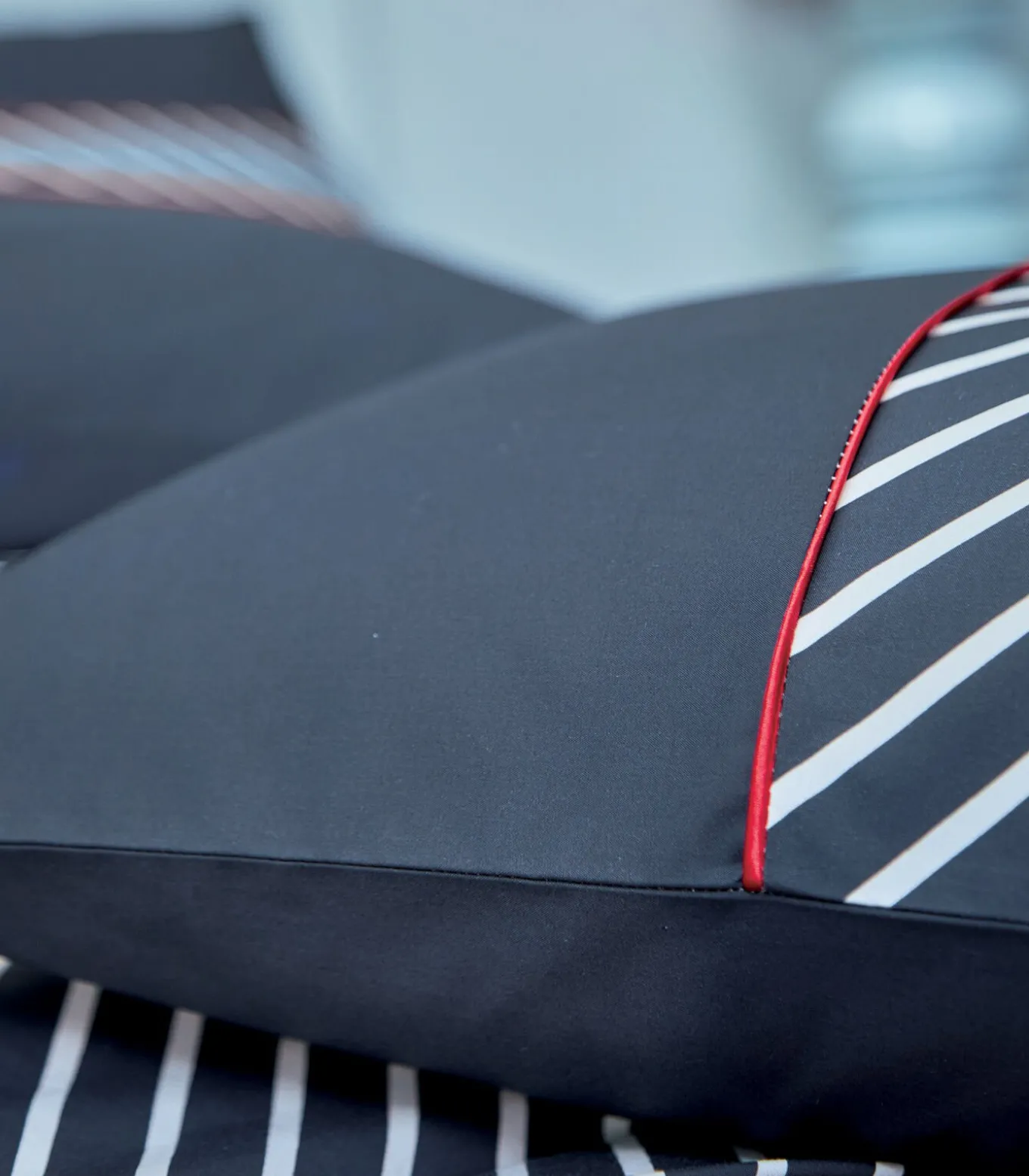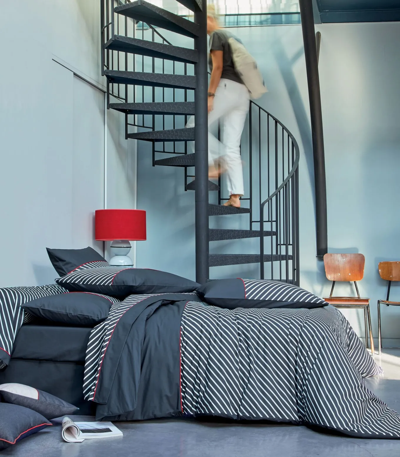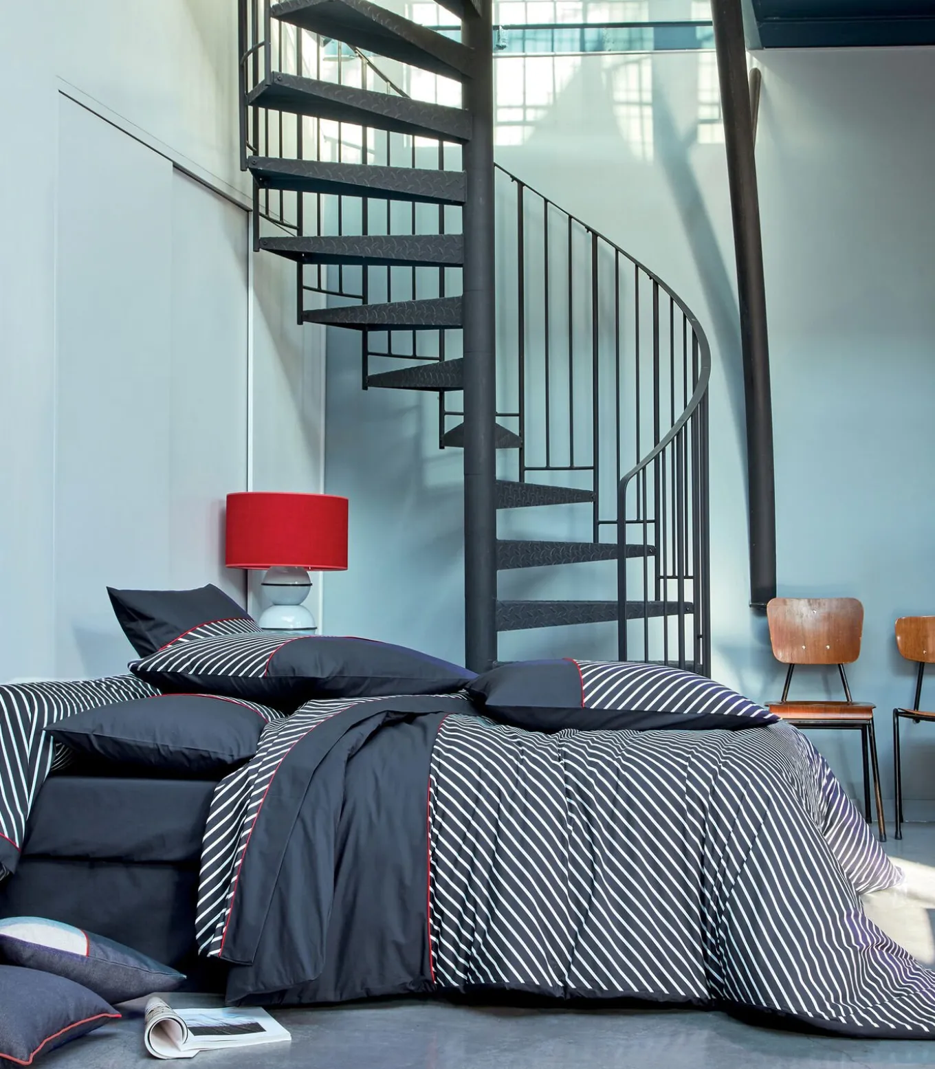 “Door samen te werken met het jeansmerk 1083, hebben we ervoor gekozen om de iconische keperstreep, zo kenmerkend voor Denim, te accentueren. We hebben het in twee kleuren afgewezen: Indigo en Mousse en geaccentueerd met een biezenafwerking. rood, de emblematische kleur van deze jonge merk.Deze items worden geweven, geverfd, bedrukt en gemaakt in de Vogezen.”