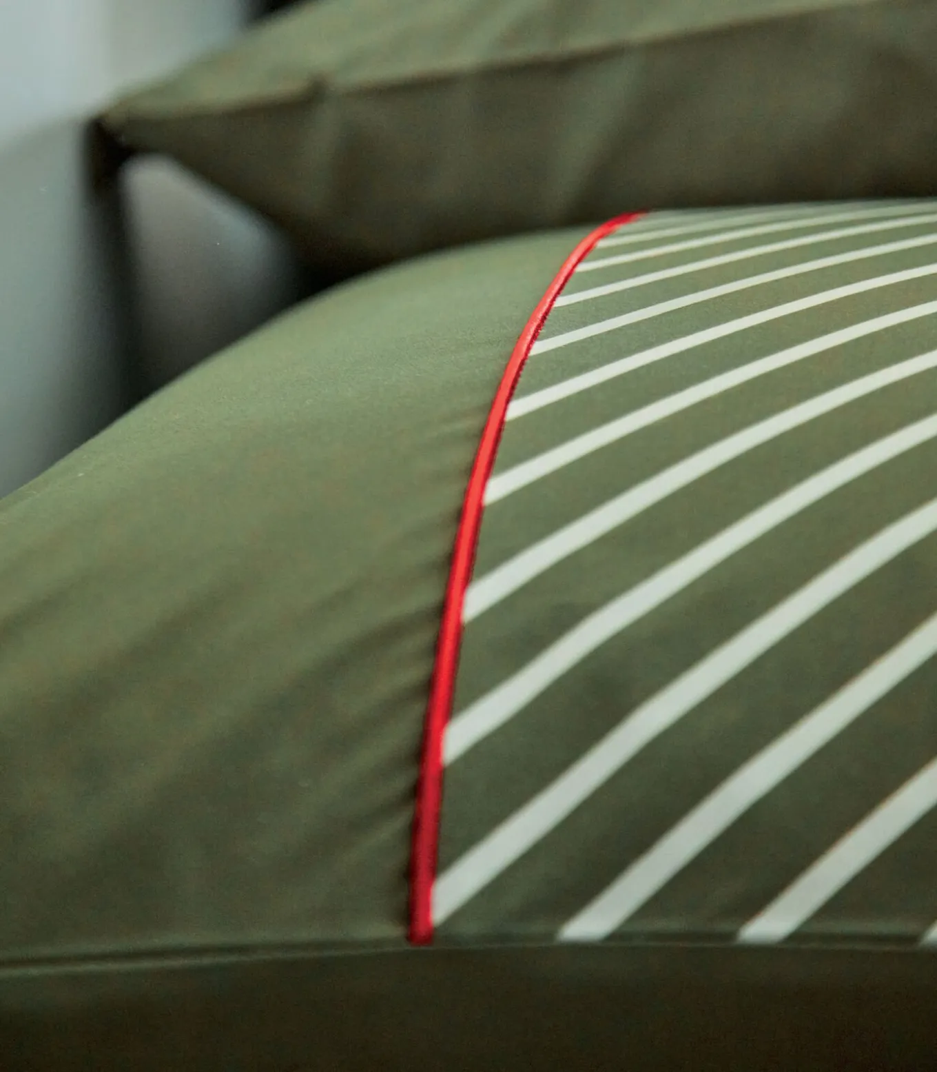 “Door samen te werken met het jeansmerk 1083, hebben we ervoor gekozen om de iconische keperstreep, zo kenmerkend voor Denim, te accentueren. We hebben het in twee kleuren afgewezen: Indigo en Mousse en geaccentueerd met een biezenafwerking. rood, de emblematische kleur van deze jonge merk.Deze items worden geweven, geverfd, bedrukt en gemaakt in de Vogezen.”