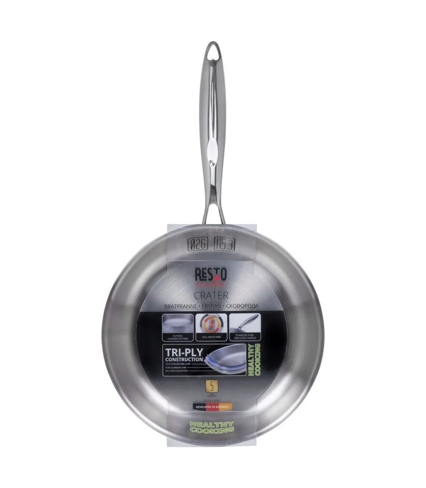 Roestvrijstalen koekenpannen zijn ontzettend populair en geven je dat onmiskenbare gevoel van professionaliteit. Het koken met deze pannen kan je het vertrouwen geven van je favoriete chef–kok en kan leiden tot verbeteringen in het eindresultaat. De stijlvolle uitstraling van deze pannen zal niet alleen bijdragen aan de uitstraling van je keuken, maar ook aan de smaak van je eten. Energiebesparend Je kunt niet zonder deze roestvrijstalen koekenpan met een superhandig ergonomisch handvat in jouw keuken! Niet alleen kan je deze pan gebruiken op inductie–, gas–, elektrische–, keramische– en halogeenkookplaten, maar het is ook een echte energiebespaarder. En wie houdt er niet van om geld te besparen op hun energierekening terwijl je ook nog eens milieuvriendelijk bezig bent? Deze pan zorgt voor een energiebesparing tot wel 25%, waardoor je portemonnee blij zal zijn en de planeet ook! TRI–PLY (18/10 roestvrij staal + aluminium + 18/10 roestvrij staal) Door een Starburst–afwerking aan de binnenkant van de pan blijft voedsel niet plakken. RVS is ideaal voor het bakken, schroeien en sauteren van voedsel. De volle, zware aluminium kern die over de bodem en langs de zijkanten van de pan loopt, zorgt voor een optimale warmteverdeling voor perfecte kookresultaten. De roestvrijstalen buitenkant maakt de pan geschikt voor de vaatwasser en de oven. Tevens zorgt het voor gemakkelijke reiniging en onderhoud. Met deze hoogwaardige pan heb je de perfecte aanvulling op je keuken en kan je elke keer genieten van heerlijke maaltijden. Hittebestendig handvat Aan de praktische elementen is zeker gedacht. Waar we vroeger op zoek moesten naar doeken om de pan te verplaatsen, is dit met de innovatieve materialen van tegenwoordig verleden tijd. Daarom heeft Resto een pan ontwikkelt met een hittebestendig handvat. Zo hoeft u niet meer bang te zijn om uw vingers te verbranden en kunt u makkelijk uw pan over het fornuis verplaatsen Extra’s – 100 % PFOA– en Teflon– vrij – Vaatwasserbestendig – Gemakkelijk schoon te maken