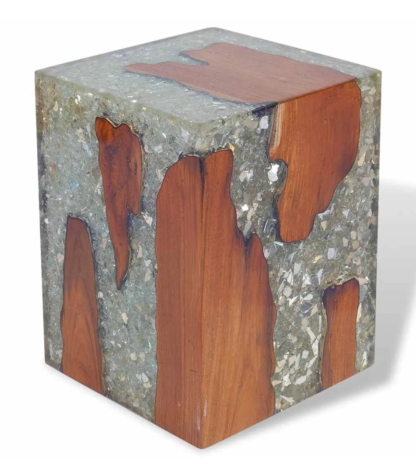 Materiaal: massief teakhout met een doorzichtige lak, transparante hars met fijn glas en multiplex