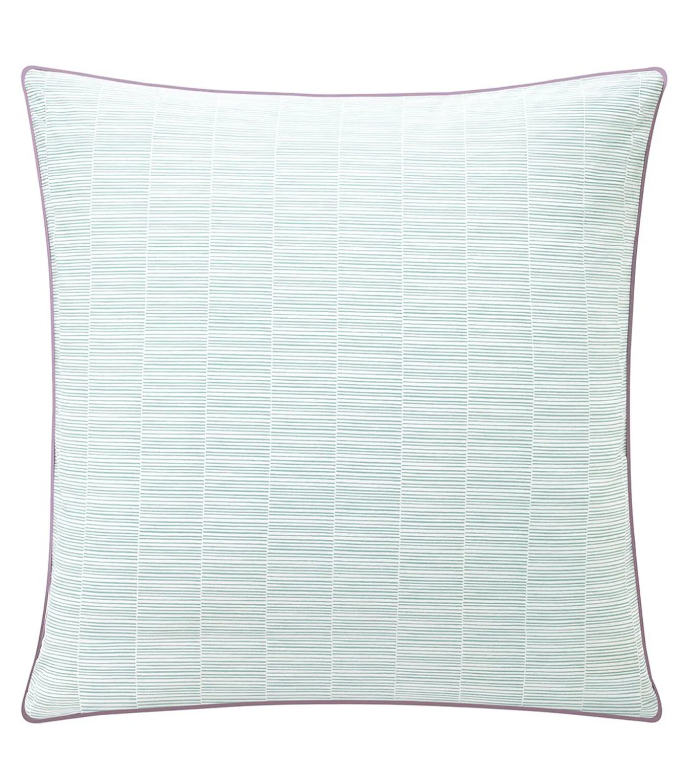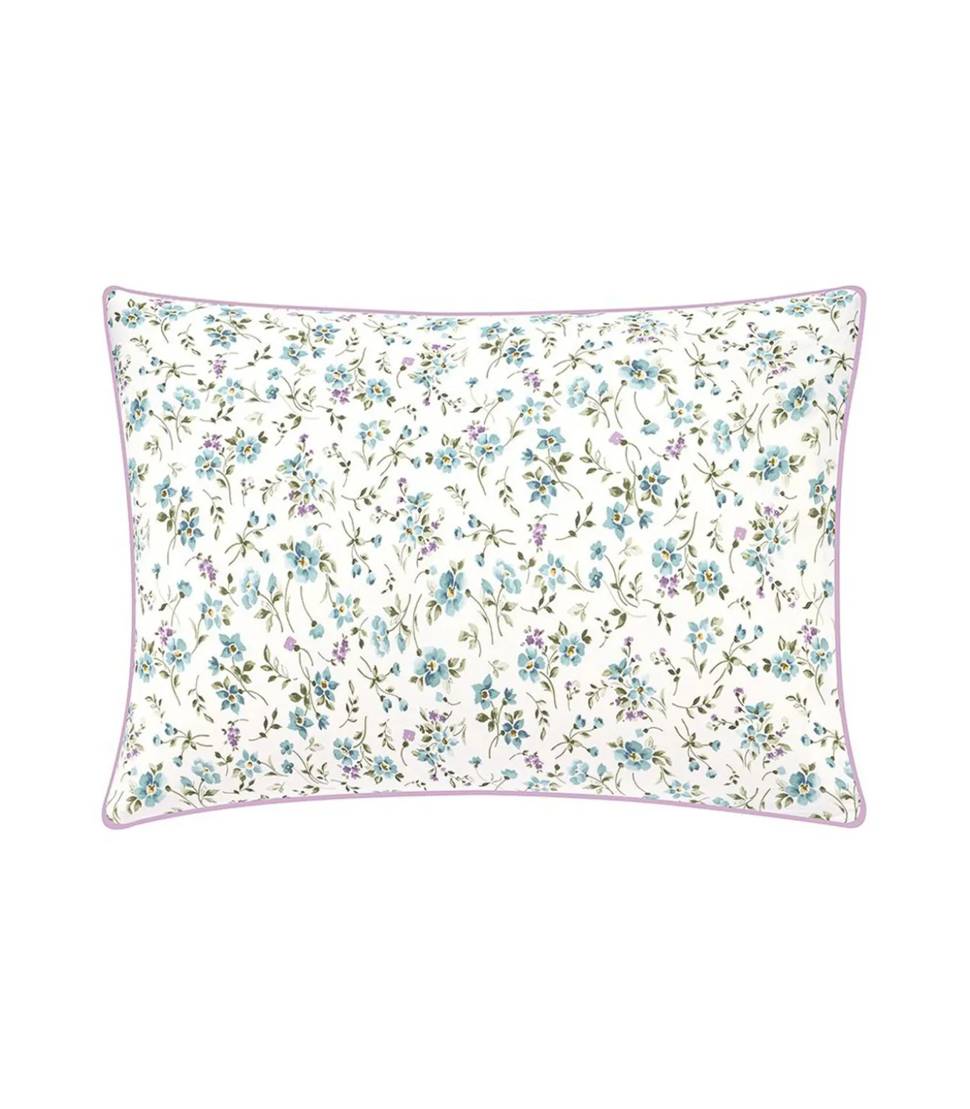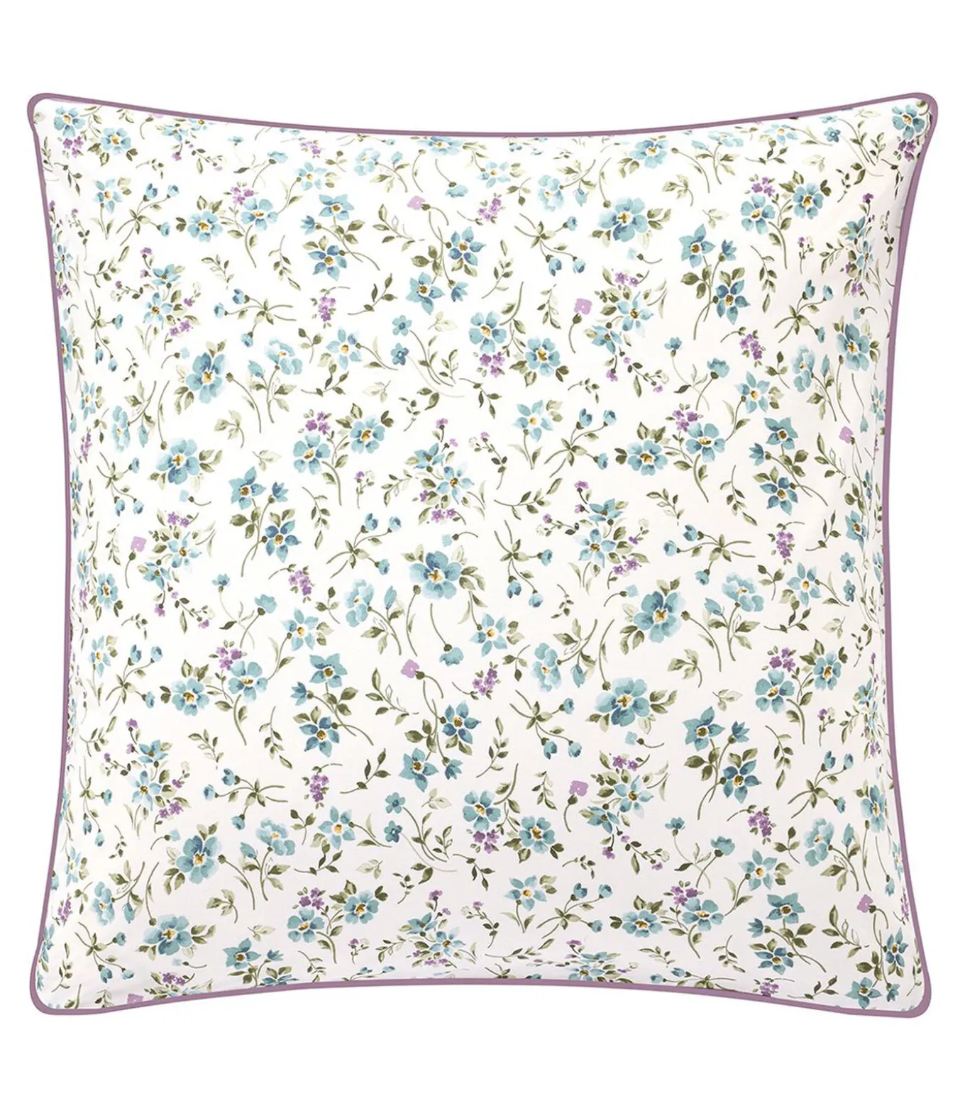 Print van viooltjes in blauwtinten en paars op ivoorkleurige achtergrondPrint van kleine horizontale blauwgroene strepen op ivoorkleurige achtergrond