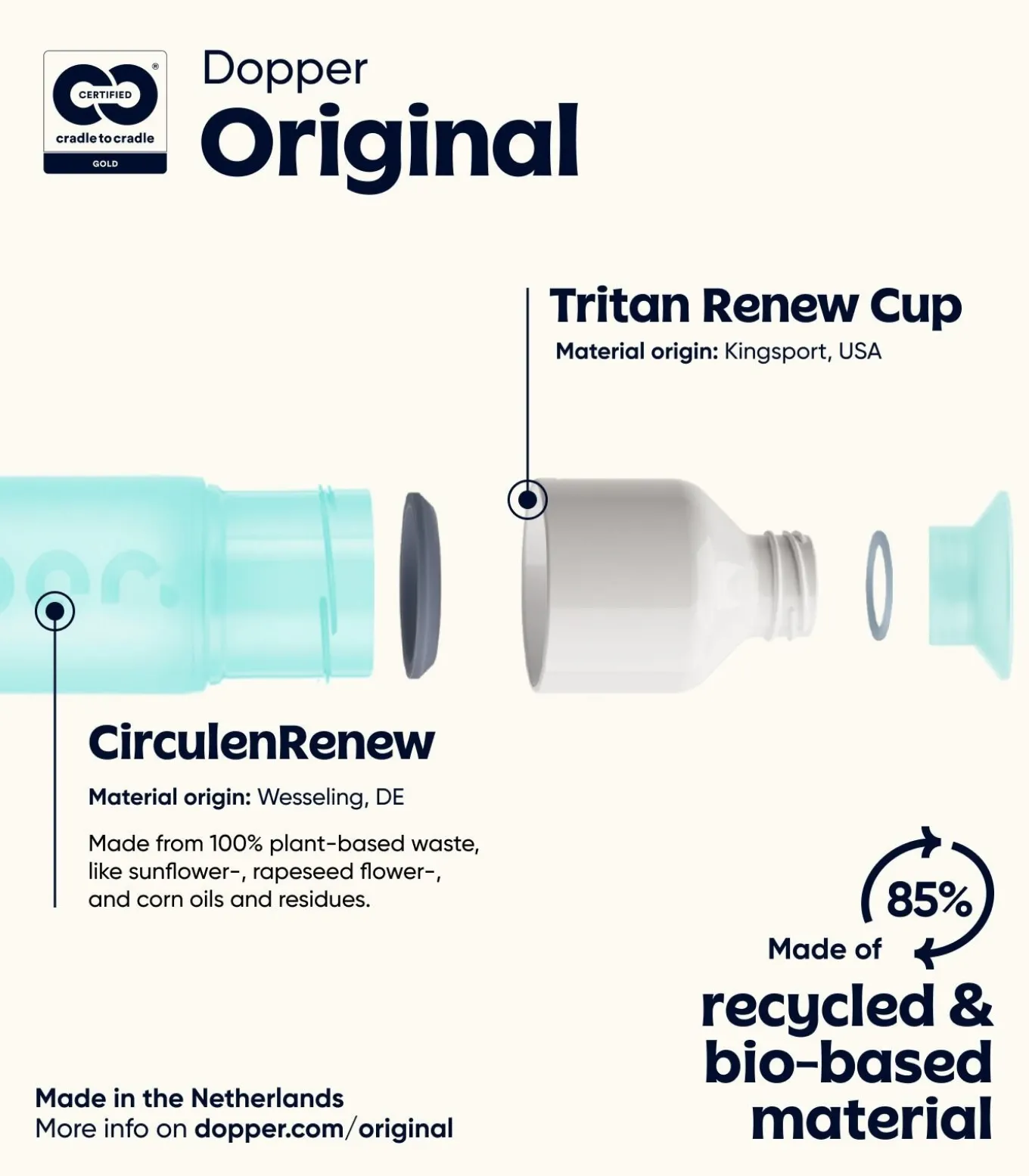 ’s Werelds eerste Cradle to Cradle Certified® Gold–flessencollectie: van ontwerp tot het einde van de levensduur voldoet jouw (zee)heldhaftige fles aan de strengste milieu–eisen en ethische normen.Geen CO2–voetafdruk: dankzij 85% geüpcyclede materialen en productie in een Nederlandse fabriek die op 100% hernieuwbare energie draait, laat de Dopper Original geen CO2–voetafdruk achter.Geen waterverspilling: tijdens de productie wordt water uit een gesloten systeem gebruikt zodat het niet in het milieu terechtkomt. 100% recyclebaar aan het einde van de levensduur.450 ml oceaanreddende perfectie, eindeloos navulbaar met kraanwater. De Dopper Original fles is vaatwasmachinebestendig (tot 65 °C), BPA– en ftalaatvrij en lichtgewicht, ideaal voor onderweg.Dopper is een Certified B Corporation: we gebruiken zakendoen als een kracht voor het goede. Elke verkochte fles vermindert plasticvervuiling en biedt toegang tot schoon drinkwater in Nepal.