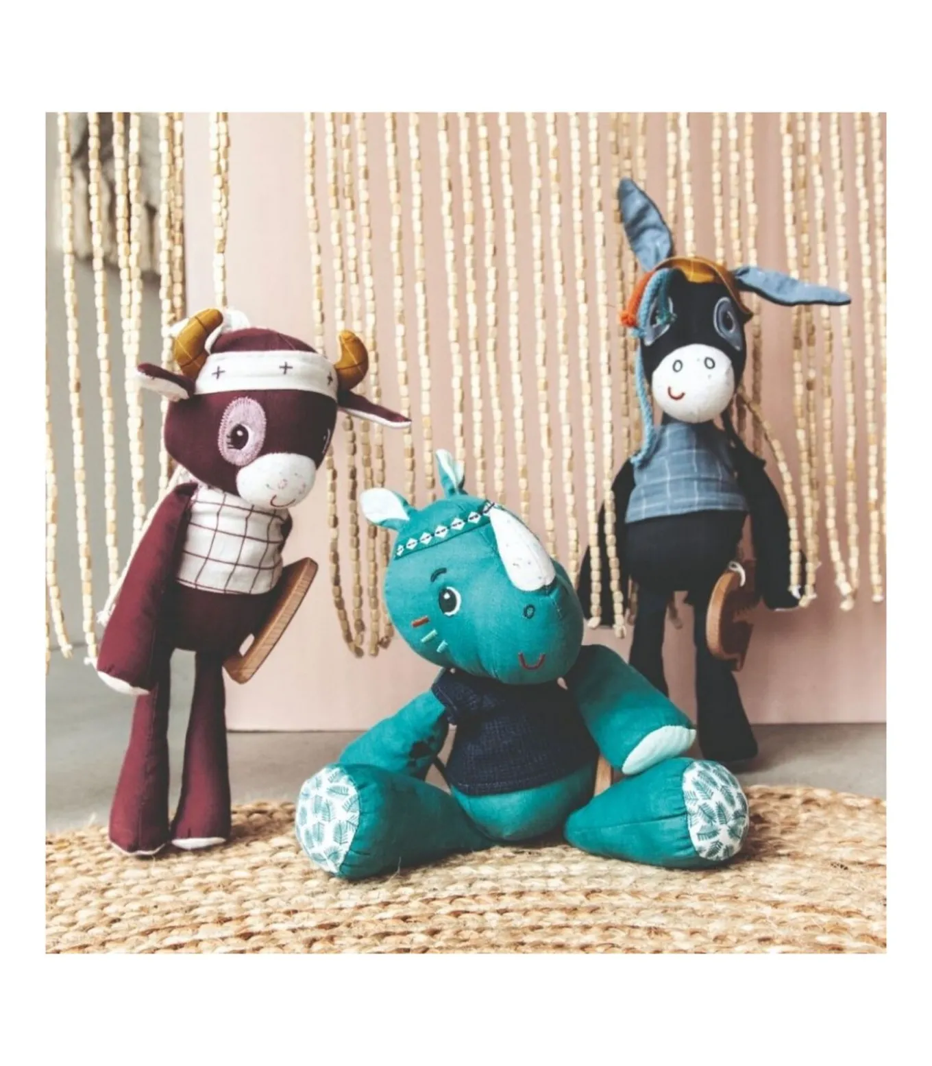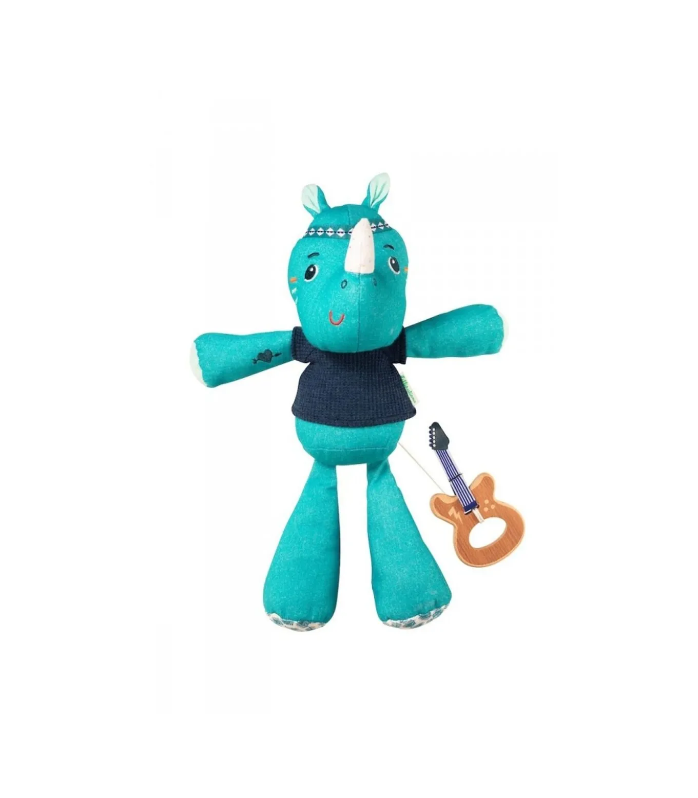 Marius de neushoorn haalt zijn elektrische gitaar boven. Op de tonen van “Light my fire” vergezelt hij stoere kleintjes naar dromenland. Gemaakt van zacht ecologisch katoen.Makkelijk wasbaar op 30°Wasinstructies: Machine wasbaar op 30°C – delicate cyclus zonder de muziekdoos en het houten instrumentAfmeting product: 13 x 18 x 30 cm