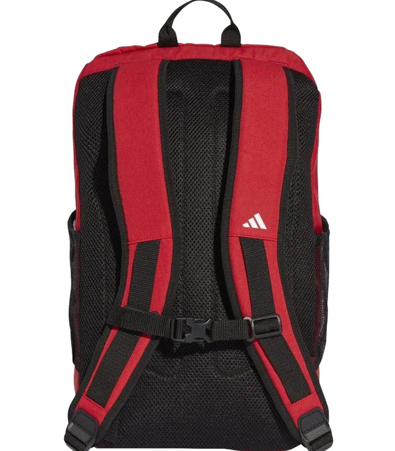 Adidas–merkrucksack van Manchester United FC in rode kleur, gemaakt van 100% gerecycled polyester. De hoogte bedraagt 50 centimeter en de breedte is 30 centimeter. Het volume is 26,5 liter en de diepte is 19 centimeter. De rugzak heeft een voorzak, rits, 2 zakken van gaas en een zijzak. Deze rugzak is 100% officieel gelicentieerd. Het interieur bevat 1 hoofdcompartiment. Er zijn verstelbare borstriem, Air Mesh op de rug, handvat, gewatteerde en verstelbare schouderbanden en een gewatteerd rugpaneel. Op het ontwerp staan het Manchester United FC–crest en logo. De rugzak wordt bevestigd met tweewegriem.