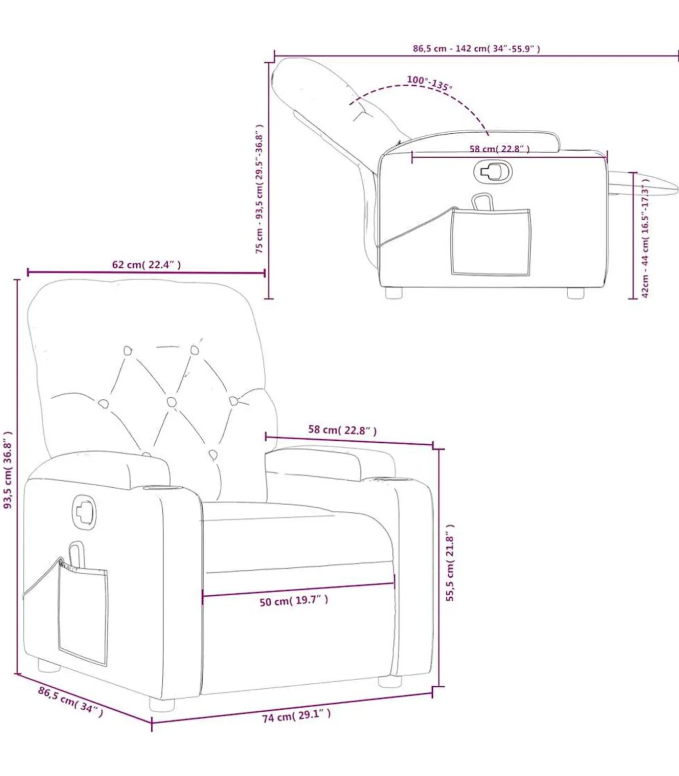 Afmetingen zitpositie: 74 x 86,5 x 93,5 cm (B x D x H)