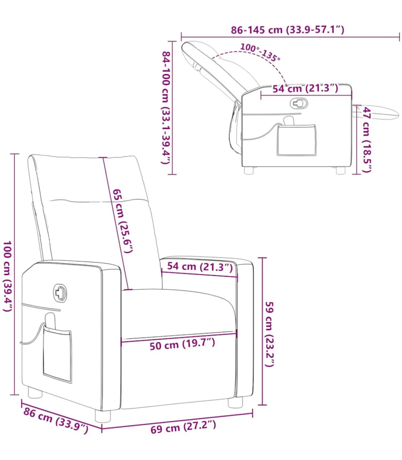 Afmetingen zitpositie: 69 x 86 x 100 cm (B x D x H)