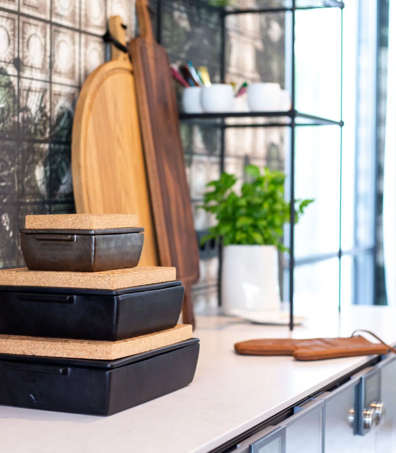 Practisch mag ook mooi zijn! De ontwerpers van Dutchdeluxes hebben een mooie design ovenschotel ontworpen met een deksel en een onderzetter van kurk. Geniet samen van je gratin, stoofpot of lasagne uit een grote schaal of een maatje kleiner. Elke ovenschaal wordt geleverd met een bijpassend deksel, zodat je perfect kunt braden en stoven. En zero waste! je hoeft namelijk geen aluminiumfolie of cellofaan meer te gebruiken, omdat je een passende deksel hebt! Zet de schaal op tafel op de bijpassende onderzetter van natuurkurk of berg de schalen veilig boven elkaar op met de onderzetter er perfect tussenin en bescherm zo het deksel.Elegant en functioneel De Dutchdeluxes ovenschotel met deksel en kurk 20×13.5×8.5cm zwart biedt een stijlvolle en praktische oplossing voor al je kookbehoeften. De ovenschotel is ideaal voor het bereiden van gratins, stoofpotten en lasagne. Het bijpassende deksel zorgt ervoor dat je gerechten perfect gebraden en gestoofd worden, terwijl de onderzetter van natuurkurk bescherming biedt en een elegante presentatie mogelijk maakt.Hoogwaardig keramiek Deze ovenschotel combineert functionaliteit en design, ideaal voor zowel dagelijks gebruik als speciale gelegenheden. Het hoogwaardige keramiek en de duurzame kurk zorgen voor een lange levensduur en een luxe uitstraling. De bijpassende deksel maakt het mogelijk om zonder afval te koken, terwijl de onderzetter van kurk extra bescherming biedt en ervoor zorgt dat je de schotel stijlvol kunt serveren.Kies voor de Dutchdeluxes ovenschotel Gemaakt van hoogwaardig keramiek en kurk Inclusief bijpassend deksel voor perfect braden en stoven Zero waste: geen aluminiumfolie of cellofaan nodig Elegante presentatie met de onderzetter van natuurkurk Veilig stapelen met de onderzetter ertussen om het deksel te beschermen .Onderhoud en advies Om de levensduur van je Dutchdeluxes ovenschotel te verlengen, wordt aangeraden om deze met de hand te wassen. Vermijd het gebruik van agressieve schoonmaakmiddelen om de glazuurlaag te beschermen. Droog de schotel grondig af na het wassen om vochtophoping te voorkomen. De onderzetter van kurk kan eenvoudig worden gereinigd met een vochtige doek. Bewaar de schotel op een droge plaats om de kwaliteit van het materiaal te behouden. Materiaal: Keramisch, Kurk Gemaakt in: Portugal Merk locatie: Nederland