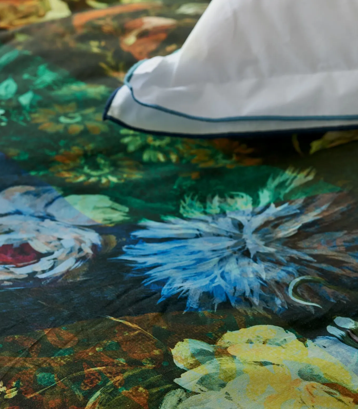Geschilderde bloemen en bladeren, prachtig gerangschikt op een grafische achtergrond voor een prachtig beddengoed in heldere kobalttinten.