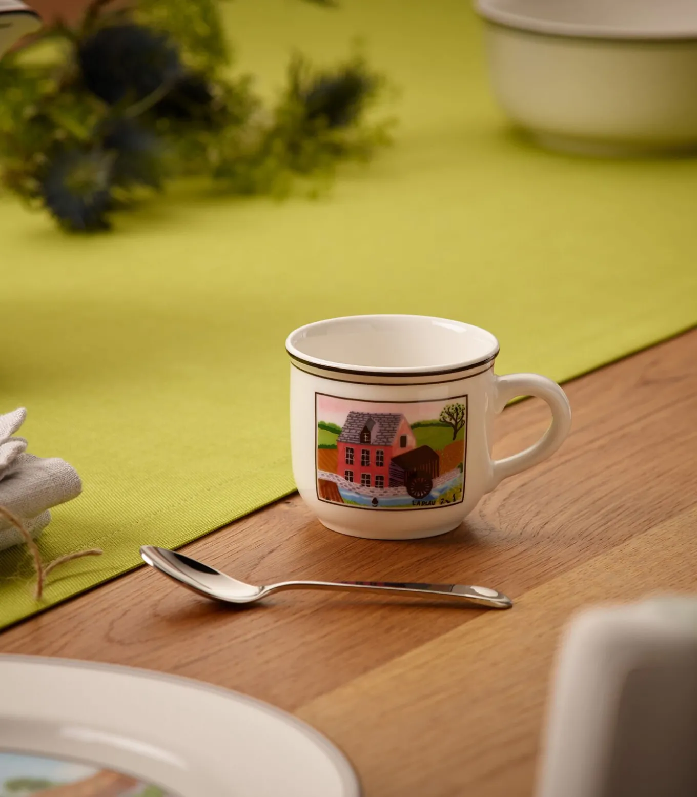 Dorpsmotieven en romantische boerderijsferen in pittoreske landschappen: de collectie Design Naif van Villeroy & Boch overtuigt met liefdevol vormgegeven scènes uit het landelijke leven. De individuele serviesartikelen zijn individuele sieraden op tafel. De speelse, eenvoudige decoratie in de stijl van de naïeve schilderkunst is van de hand van de Corsicaanse kunstenaar Gérard Laplau. Sinds 1748 produceert het traditierijke bedrijf Villeroy & Boch voor de hoogste eisen. Dit kopje past perfect bij een sterke, pittige mokka of espresso. De harmonisch afgeronde vorm is zowel klassiek als elegant. Ontdek de stijlvolle servierkunst van Villeroy & Boch. Natuurlijk geschikt voor de vaatwasser en magnetron.