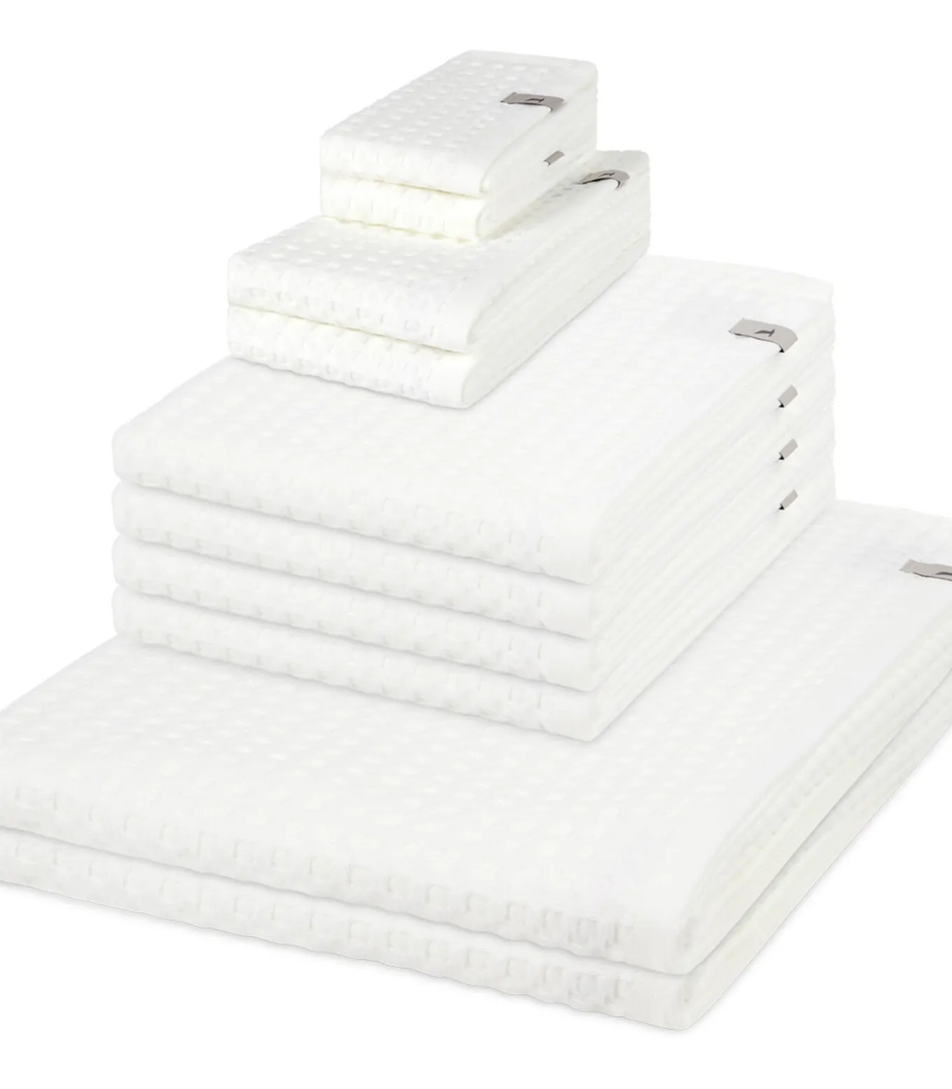 De Piquée–lijn van licht getextureerd wafelpiqué biedt een zachte massage bij het afdrogen en is aangenaam licht tegen de huid. Ze zijn gemaakt van absorberend katoen van hoge kwaliteit, zijn extra zacht en gemakkelijk te onderhouden. Met een praktische koordhanger en verkrijgbaar in subtiele kleuren kunnen ze perfect gecombineerd worden en brengen ze vakantieflair in de badkamer. Set bestaat uit: 2 X handdoek (50 X 100cm), 2 X douchehanddoek (70 X 140cm), 2 X gastendoek (40 X 70cm), 2 X zeepdoekje (30 X 30cm).