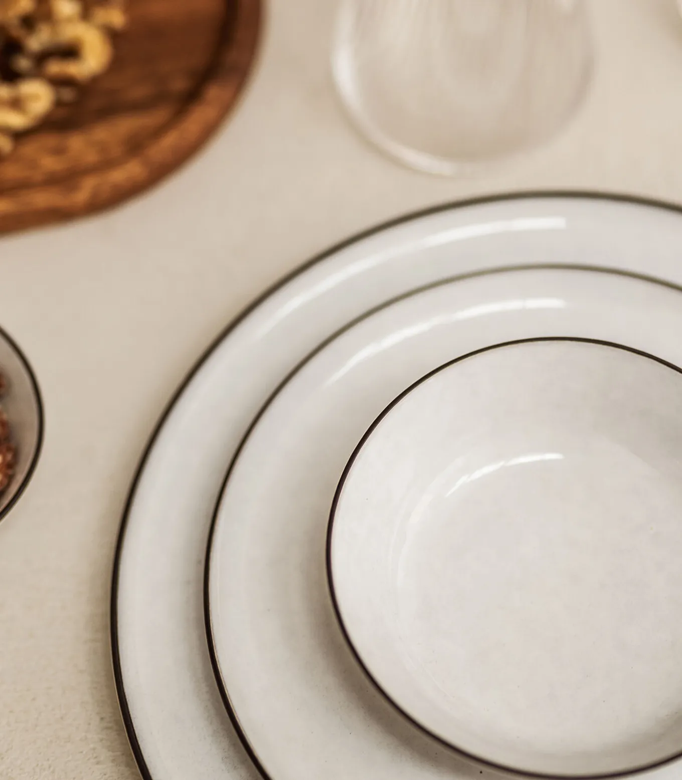 Welkom in de wereld van verfijning met onze Fina collectie. Met een klassiek wit ontwerp en een kenmerkende zwarte rand, biedt dit servies een tijdloze elegantie voor elke gelegenheid. Maar er is meer dan wat op het eerste gezicht lijkt – de subtiele wolkachtige uitstraling geeft dit servies net dat beetje extra, waardoor elke maaltijd een moment van eenvoudige pracht wordt.
