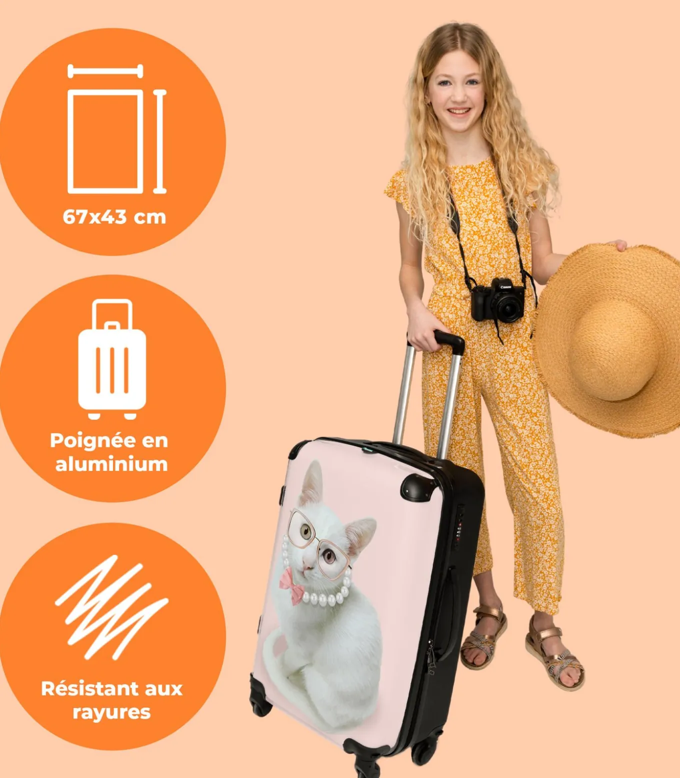 Ruimbagage koffer met 4 wielen en TSA slot (Kat – Parels – Bril – Roze)