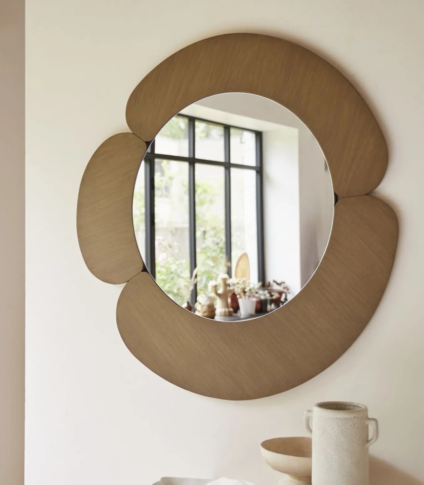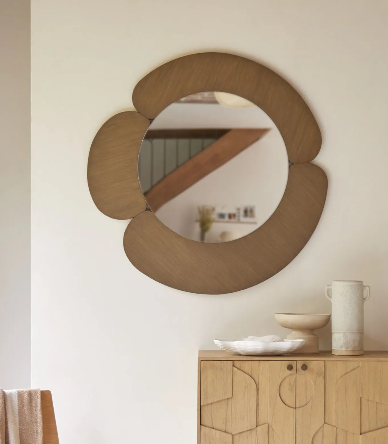 U vindt dezelfde bohemien stijl van onze ronde spiegel Sara in massief mindihout bij de meubels in ons neo–etnisch assortiment.