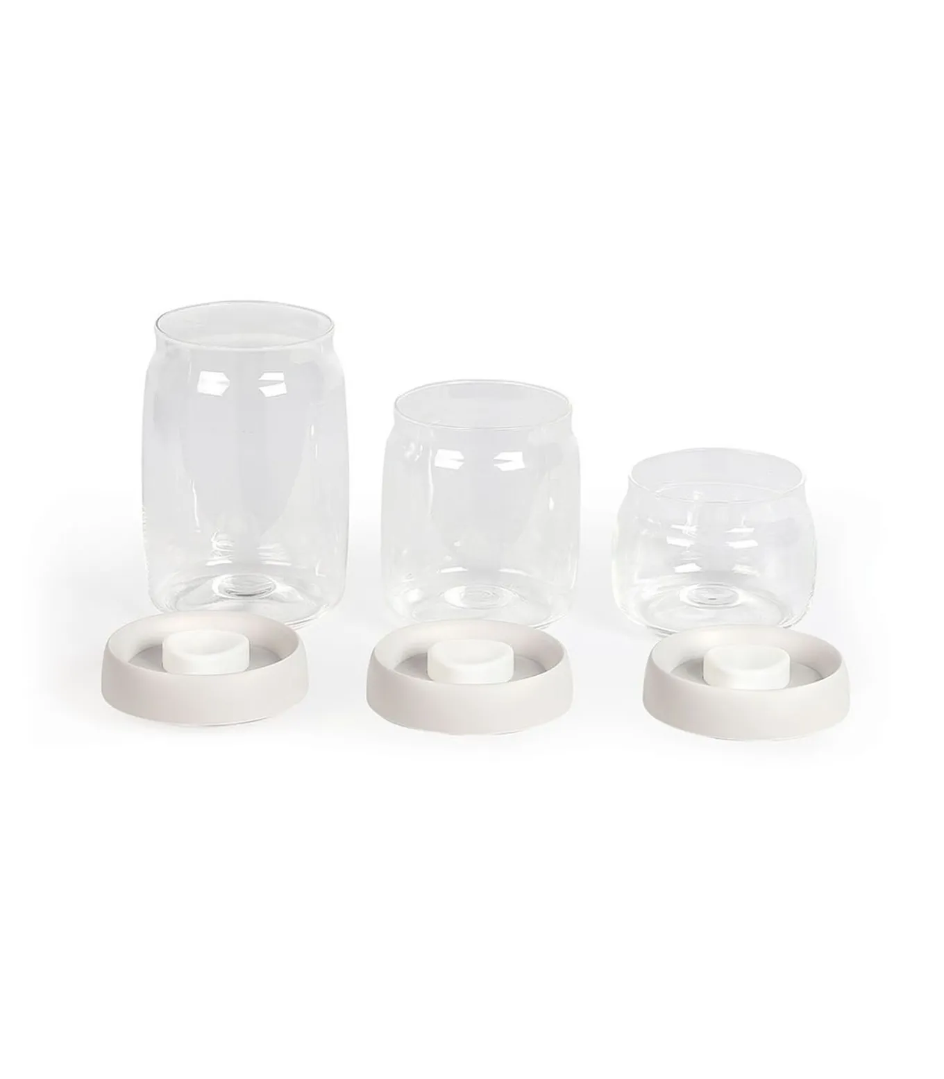 3 potjes, Borosilicaat glas, Deksel met geïntegreerde vacuümafdichting, Voor het bewaren van pasta, peulvruchten, granen, gedroogd fruit en andere voedingsmiddelen en bereidingen, Inhoud 400ml, 800ml, en 1,2L