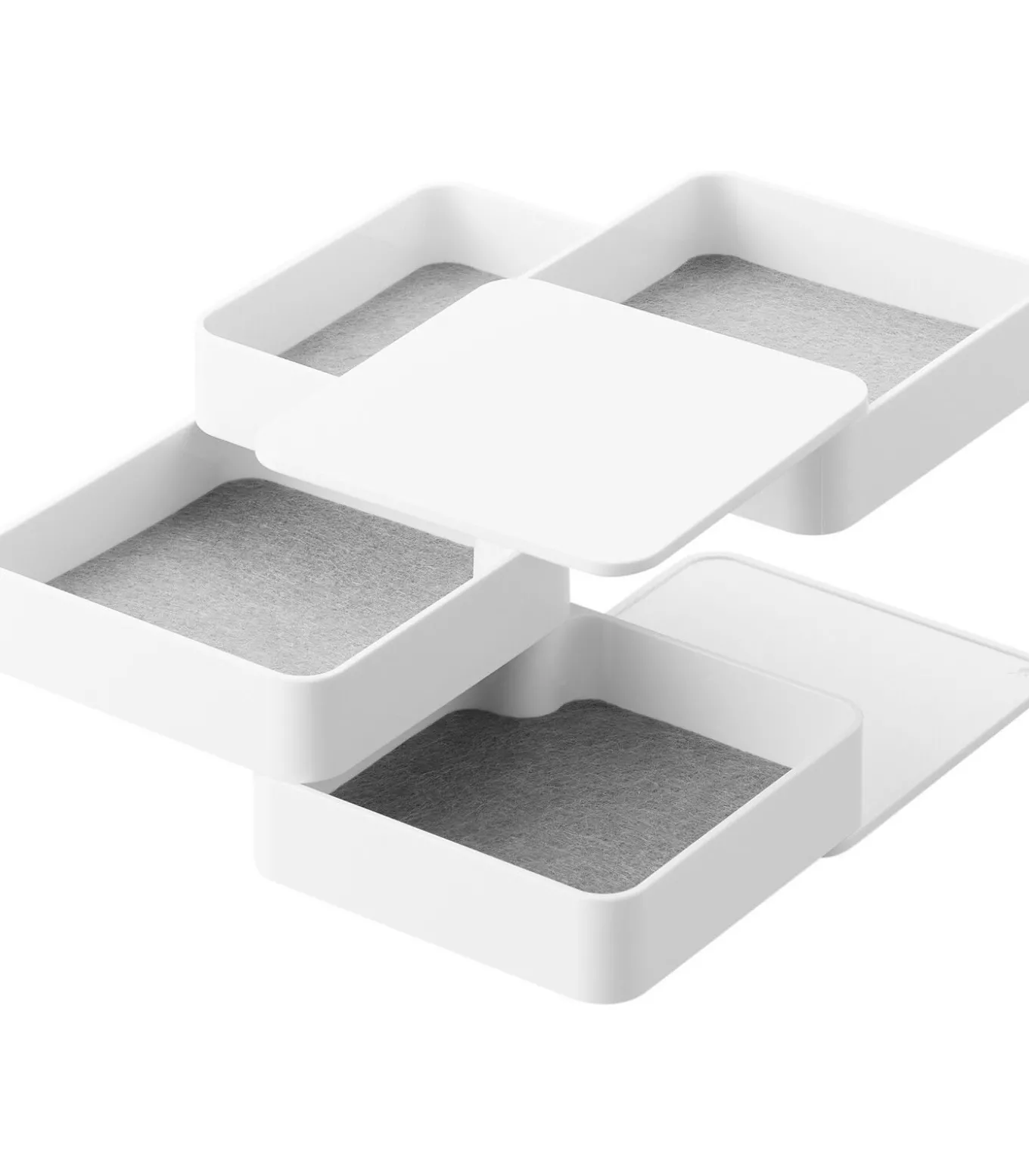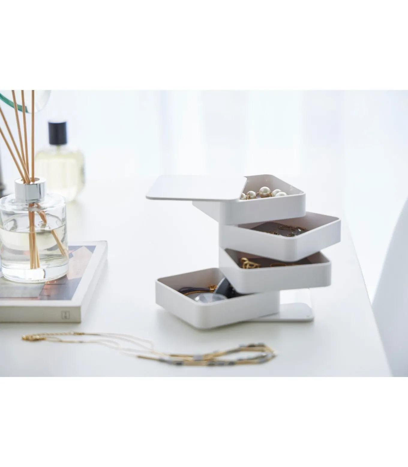 Deze elegante sieradendoos van Yamazaki heeft vier draaibare bakjes, perfect voor het opbergen van sieraden, horloges en andere accessoires. Door eenvoudig aan de gewenste laag te draaien, haal je snel het juiste item tevoorschijn. Alle lagen zijn voorzien van een deksel, zodat de sieraden stofvrij blijven en netjes opgeborgen zijn.