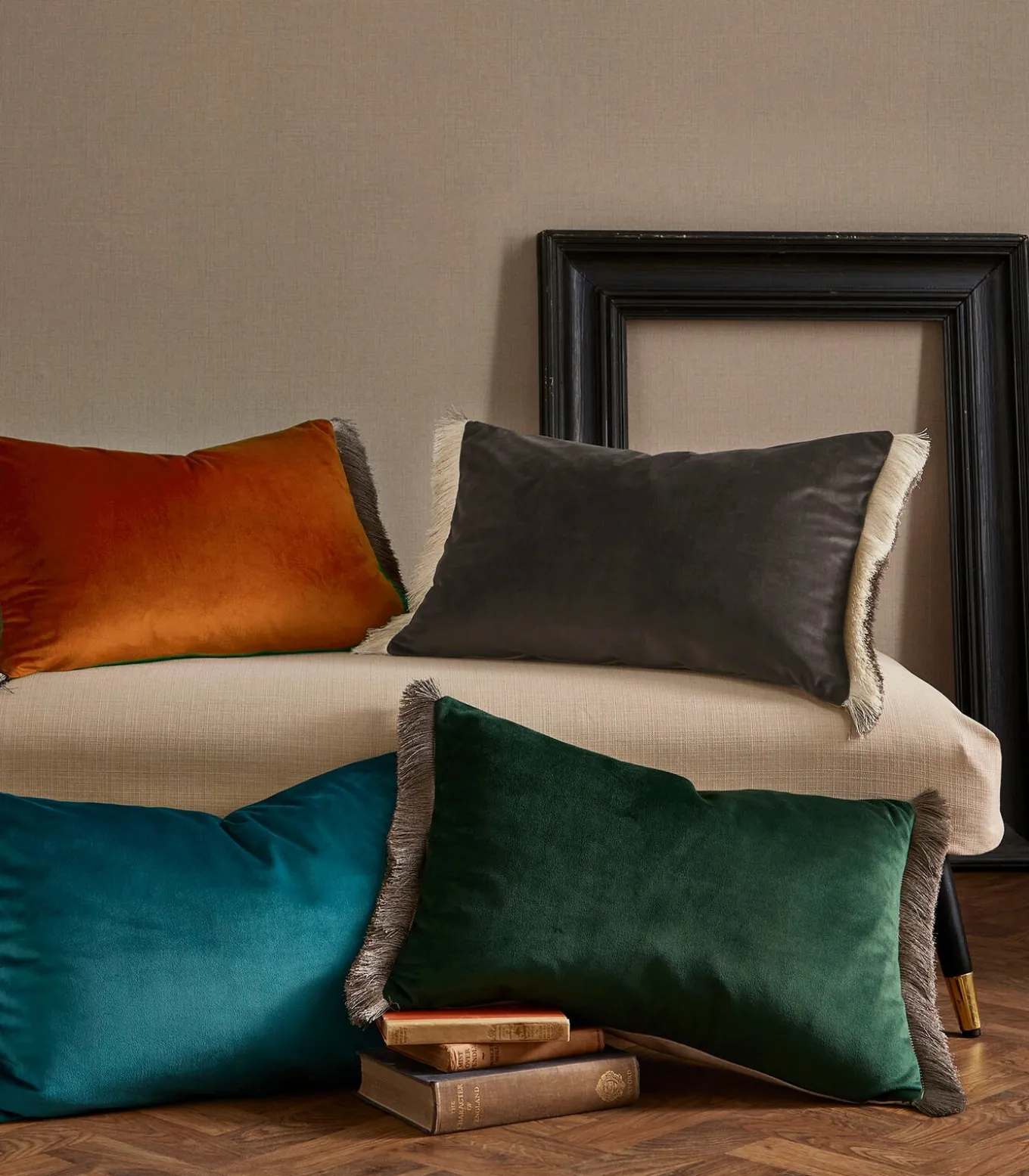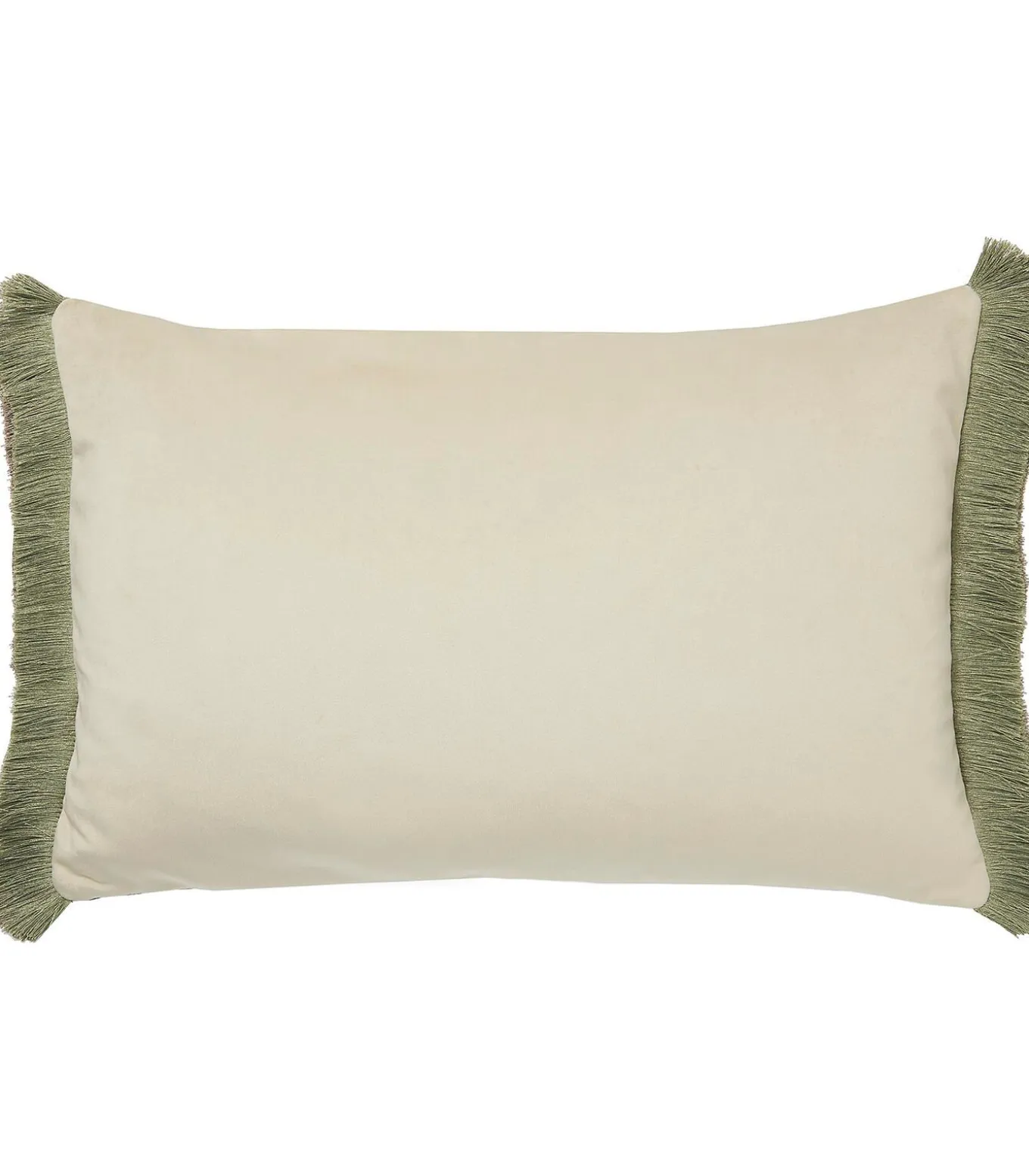 Het diepgroene fluweel, de elegante franjes en de zachtbeige achterzijde van dit kussen geven je interieur net dat vleugje kleur.