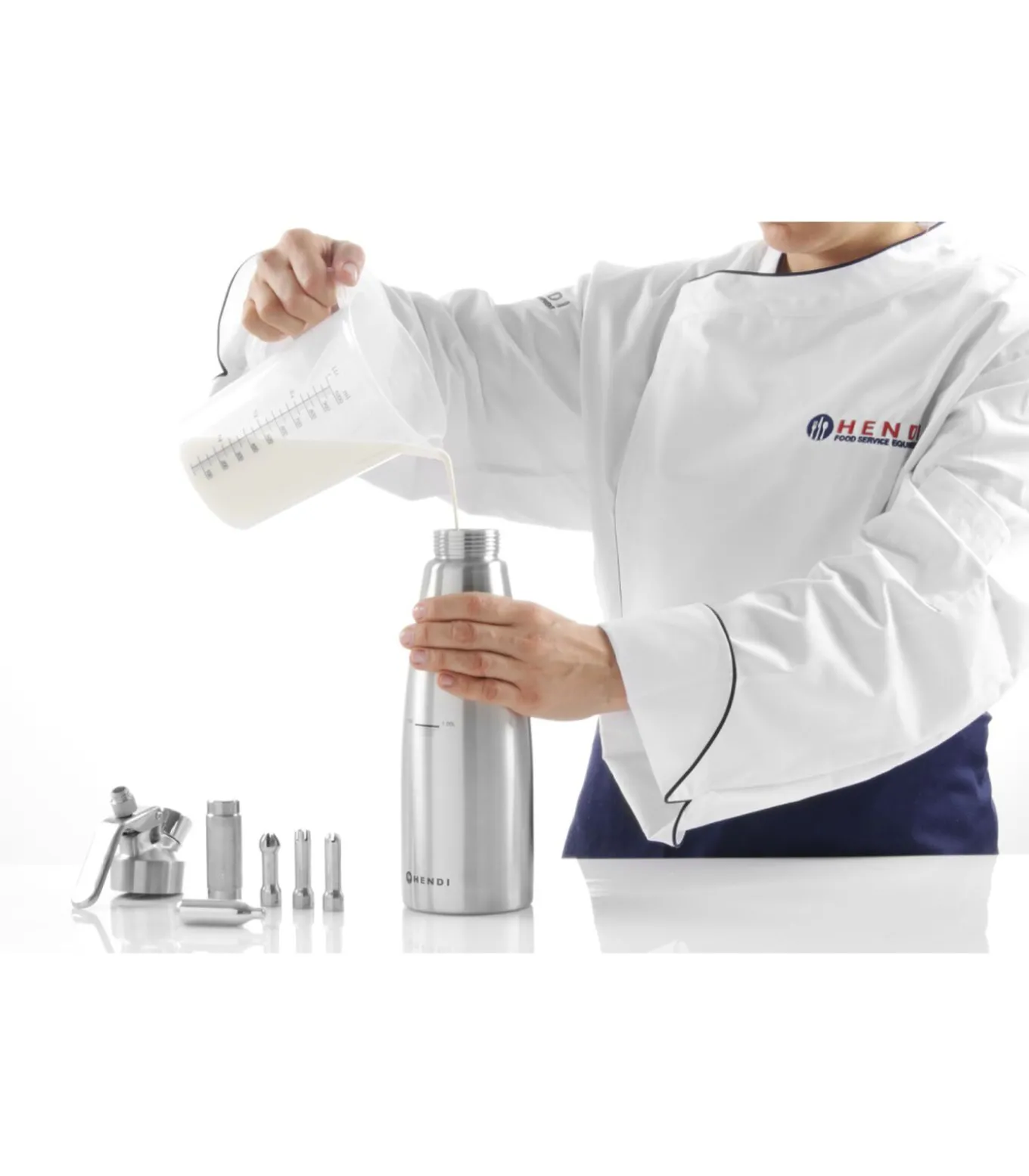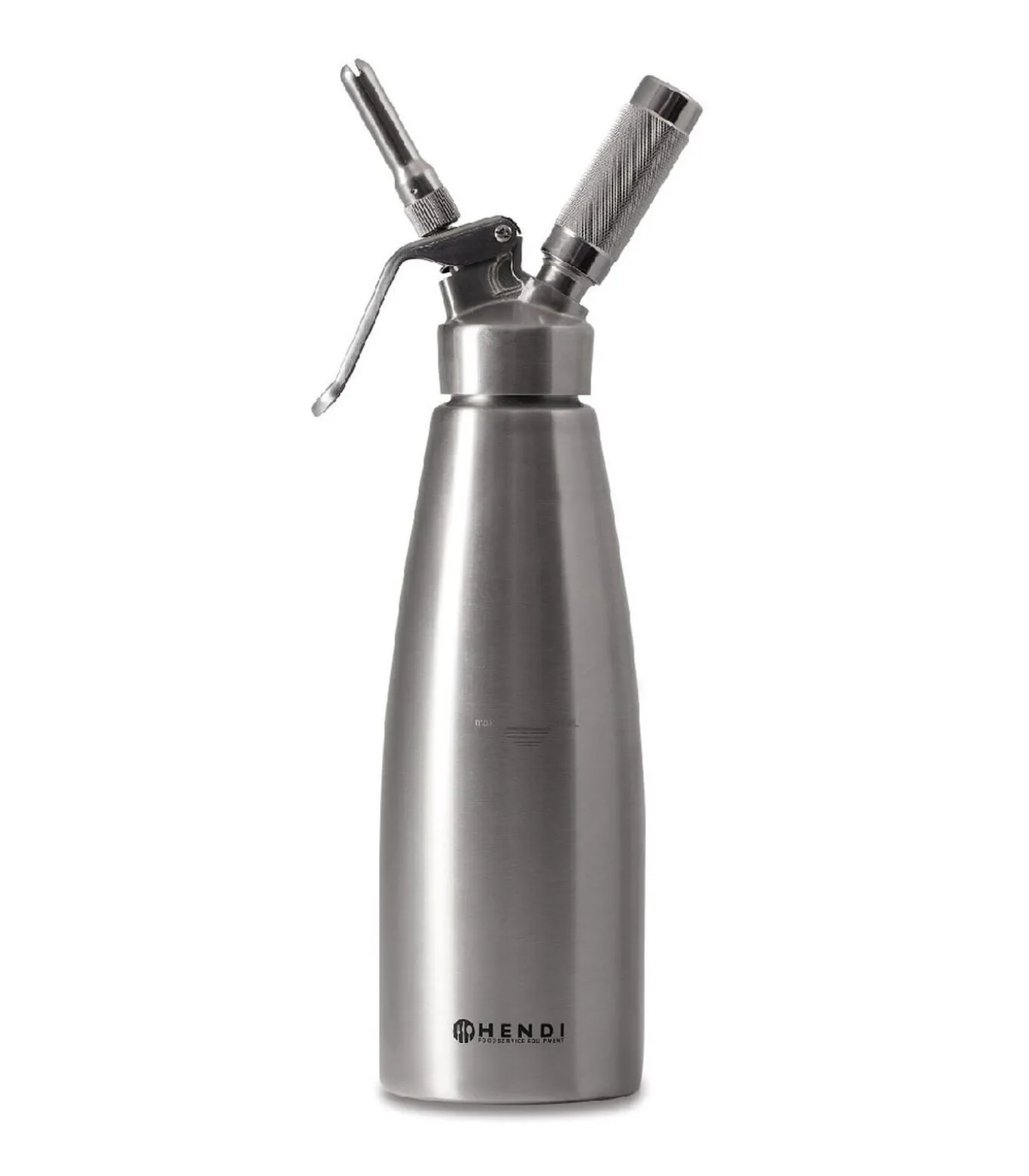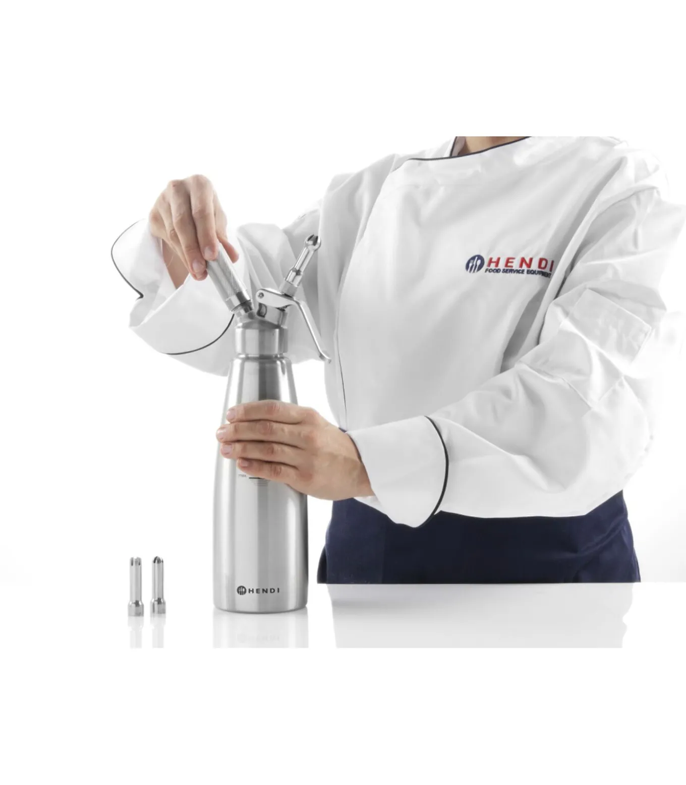 Met deze professionele slagroomspuit van Hendi kunt u heerlijke mousses, desserts, koffie en slagroom maken. Ook warme sauzen tot 70 graden kunnen met deze slagroomspuit gemaakt worden. Als u de inhoud wilt bewaren in de koelkast, dan blijft de inhoud tot 14 dagen vers. * 1 Liter * Voor zowel warm als koude gerechten! * Inclusief 2 RVS spuitmondjes en 1 polypropyleen spuitmondje * Slagroompatronen NIET inbegrepen