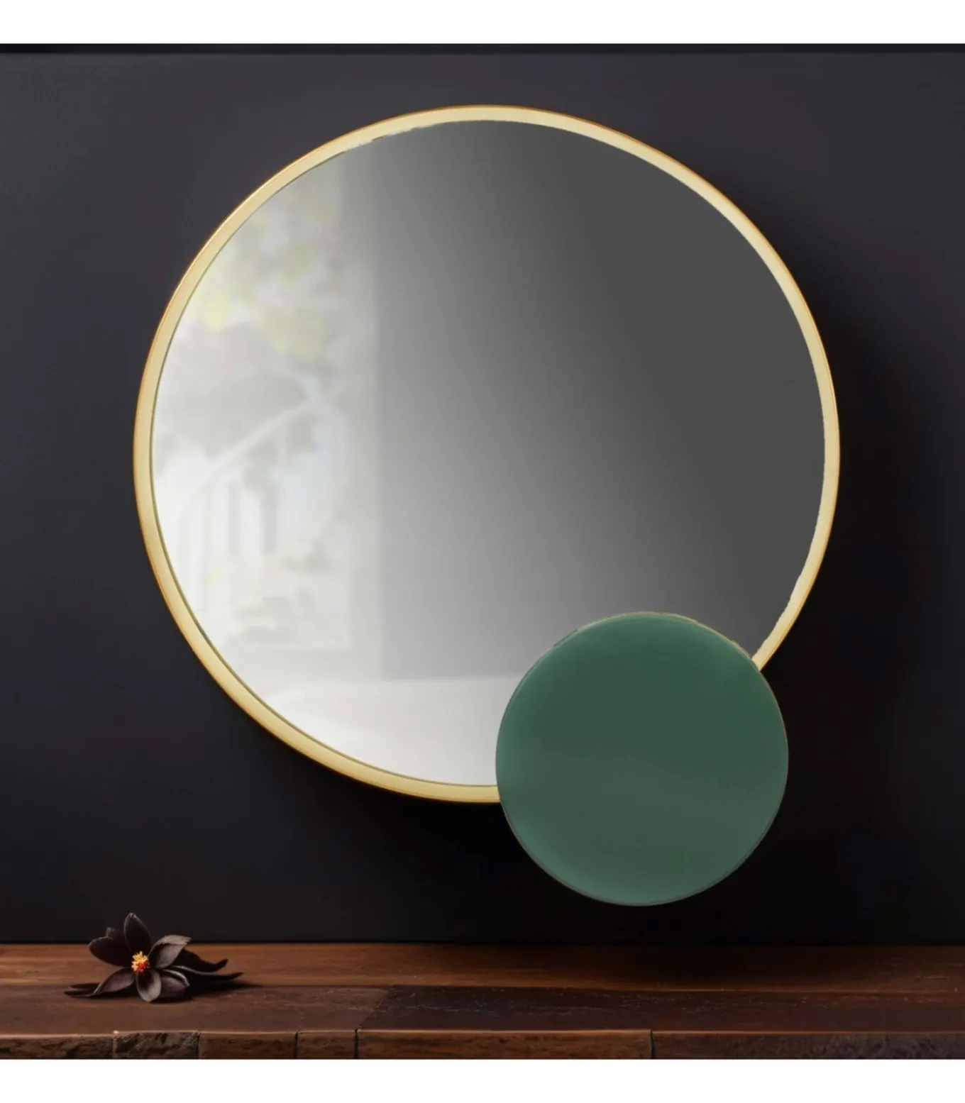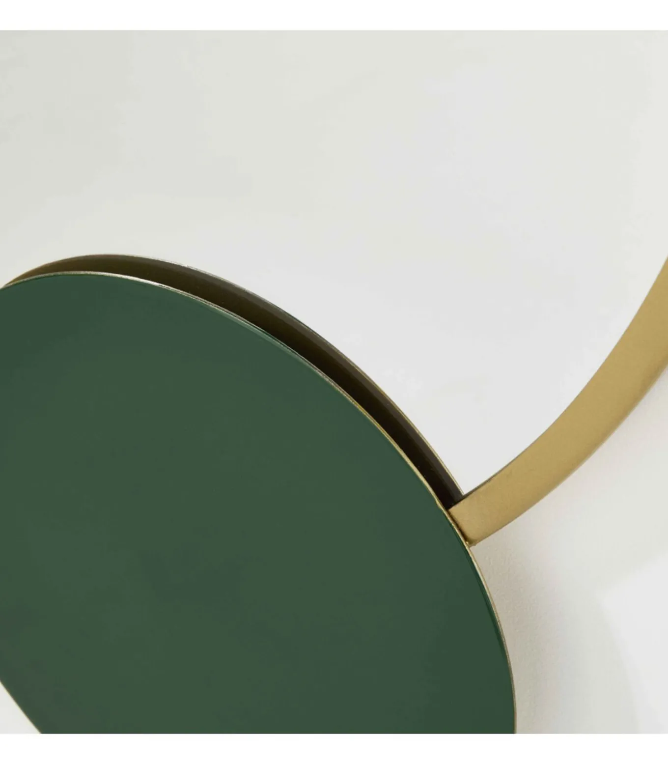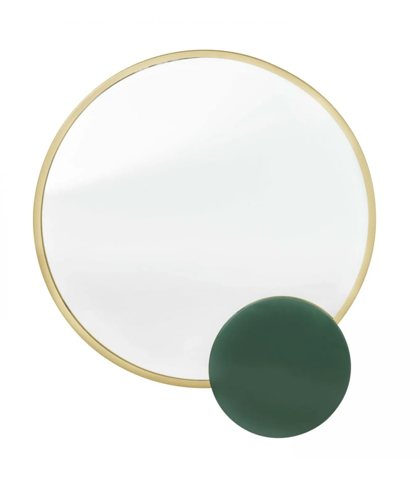 Met de ronde keramische spiegel EKLYPS voegt u een vleugje durf toe aan uw interieurdecoratie! Dit decoratieve object is omgeven door een messingkleurige omlijsting. Een detail van groen geëmailleerd metaal siert de onderkant van de spiegel. Als een eclips verrast en verheugt de combinatie van de twee ronde vormen tegelijkertijd! De klassieke ronde spiegel wordt op deze manier opnieuw uitgevonden met originaliteit. Het vleugje groene kleur past perfect bij een lichte en sobere muur. En als u naast deze spiegel keramische frames ophangt die dezelfde kleur herinneren? Kies een tafellamp in messingkleur met een groene lampenkap voor een totale harmonie. Ideaal om de muur van een woonkamer of slaapkamer aan te kleden, brengt de EKLYPS–spiegel een trendy touch aan uw interieur. U kunt hem ook boven een dressoir of commode in een hal bevestigen voor een laatste kam door voordat u vertrekt. Laat u verleiden door dit buitengewone decoratieve object? Afmeting: 67 cm