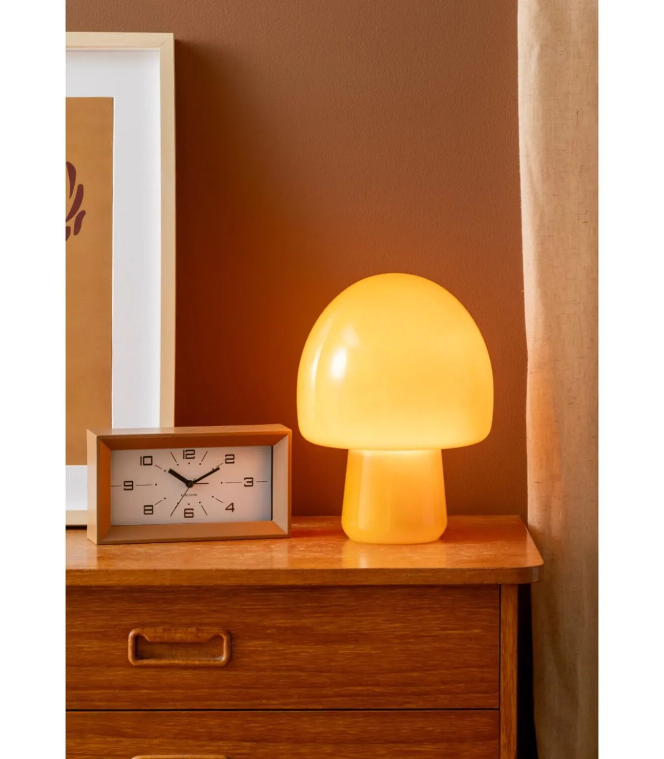 Breng warmte en gezelligheid in huis met deze betoverende paddenstoelvormige tafellamp van glas. Het speelse ontwerp met zijn ronde vormen en glanzende afwerking geeft de lamp een charmante uitstraling die direct een knus thuisgevoel oproept. Zodra het licht aangaat, verspreidt het glas een zachte gloed die uw interieur omhult met een warme en sfeervolle verlichting ideaal voor ontspannen avonden of gezellige momenten samen. Deze veelzijdige lamp voelt zich overal thuis: als nachtlampje op het nachtkastje, als design tafellamp in de woonkamer, als decoratief accent op een dressoir of bijzettafel, of zelfs als stijlvolle toevoeging in een kantoor of kinderkamer. Dankzij het retro en vintage geïnspireerde design met een vleugje Scandinavische eenvoud, past deze lamp moeiteloos in uiteenlopende woonstijlen van modern en minimalistisch tot warm en eclectisch. Met een breedte van 20 cm en een hoogte van 27 cm heeft deze lamp het perfecte formaat om op subtiele wijze sfeer te brengen én tegelijk als opvallende eyecatcher uw interieur compleet te maken.