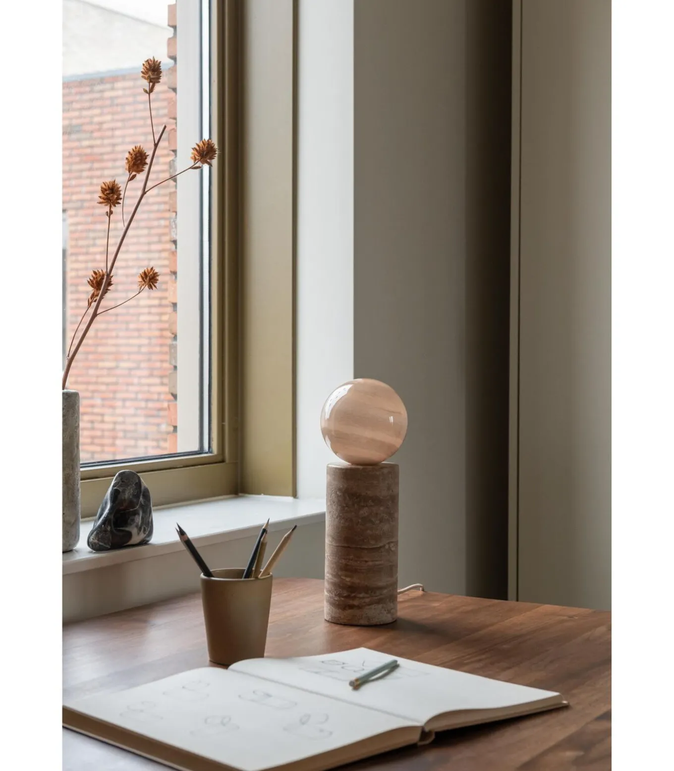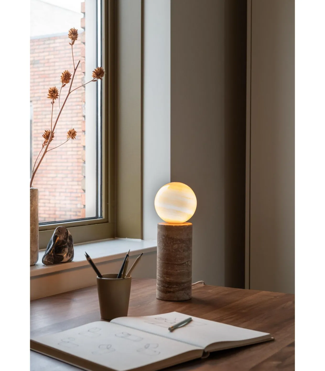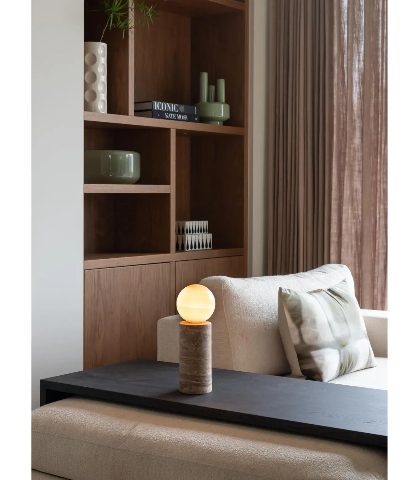 De Tivoli tafellamp in een warme zand kleur heeft een bijpassende bolvormige kap en een stevige travertijnen voet. De zware, stabiele basis zorgt voor een veilige plaatsing, terwijl de materialen en zachte vormen een gevoel van rust en elegantie geven. Dankzij het tijdloze ontwerp past de lamp in zowel moderne als klassieke interieurs en creëert hij een warme, sfeervolle uitstraling.