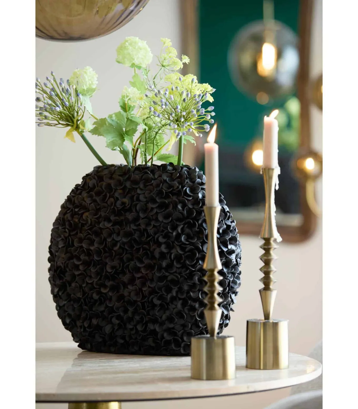 Blaas nieuw leven in uw bijzettafel met de speels intrigerende Phylia bloemenvaas. Gemaakt van lichtgewicht zwart kunststof, is deze vaas voorzien van een uniek, getextureerd oppervlak dat zowel speels als interessant is. Het patroon voegt een vleugje dynamiek en dimensie toe, waardoor de vaas zelfs zonder bloemen een statement maakt. De lichtgewicht kunststof constructie maakt hem gemakkelijk te verplaatsen en te schikken, terwijl het gewaagde ontwerp een kleurrijke touch geeft aan uw ruimte. Deze vaas is perfect voor het presenteren van een levendig sierboeket of een enkele, dramatische bloem, waarbij de bloemen door zijn uiterlijk kunnen schitteren. Dit veelzijdige stuk biedt een stijlvolle en functionele manier om uw interieur te verfraaien.