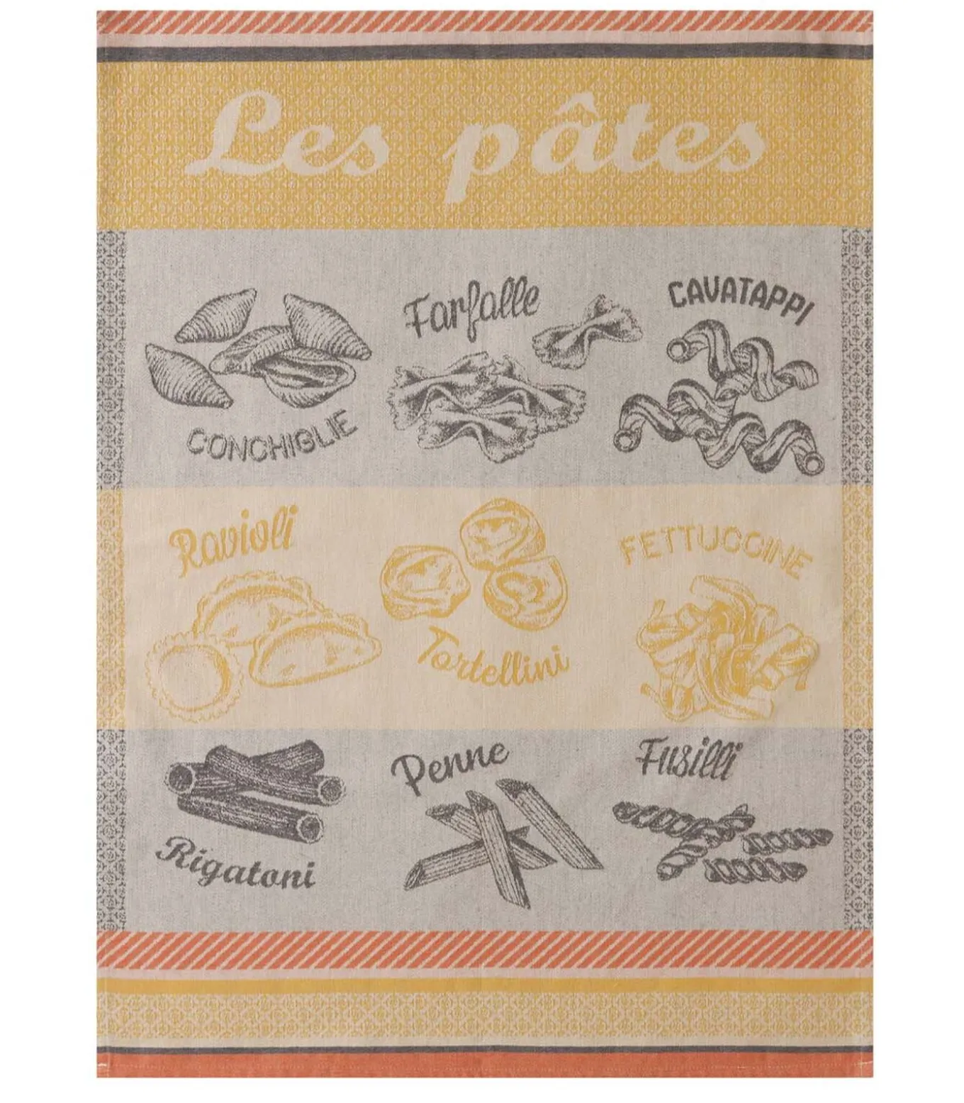 Pastaliefhebbers, deze theedoek is gemaakt voor jullie! Ontdek een katoenen theedoek die de variëteiten van pasta voorstelt