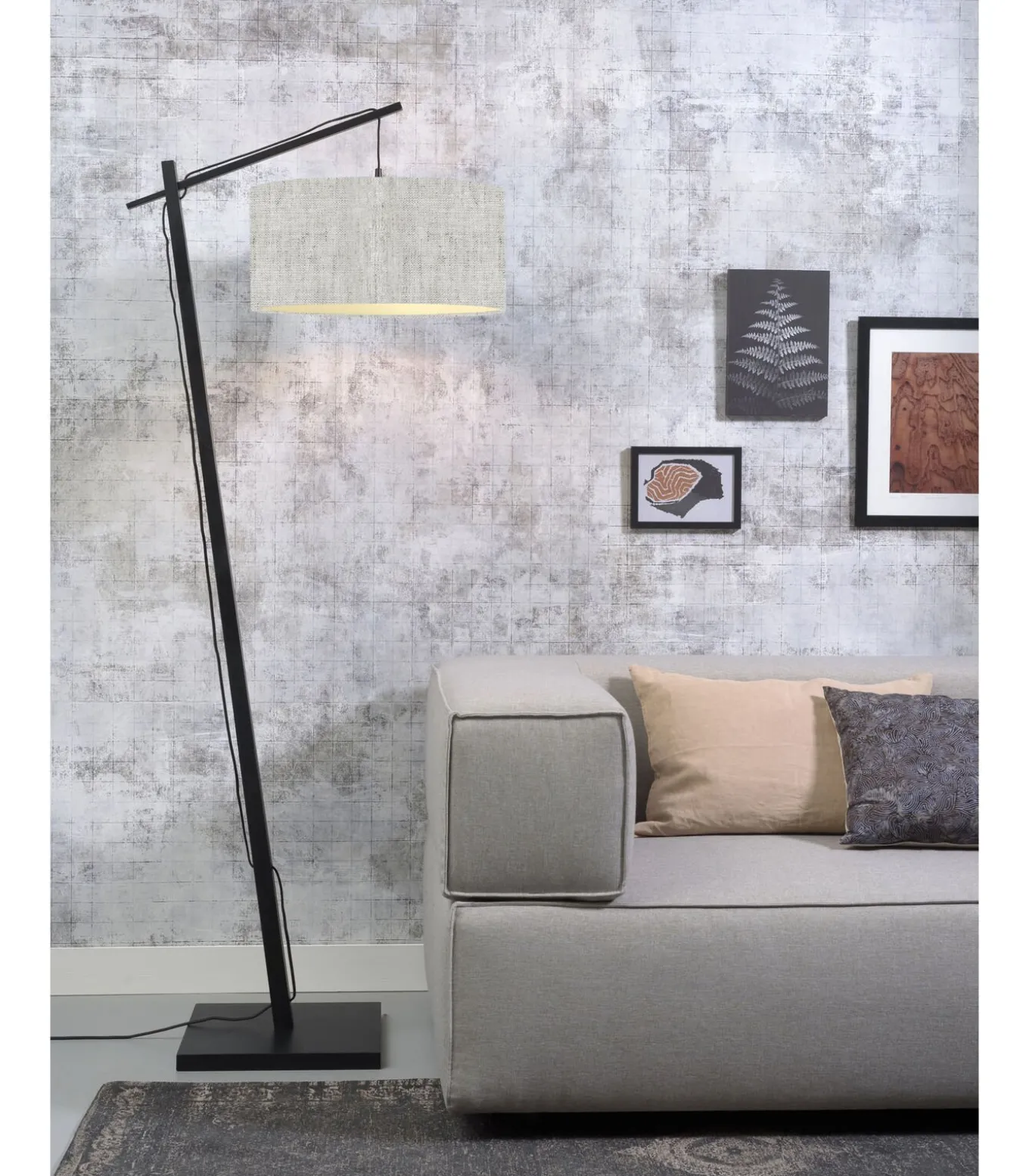 Breng een verfijnde touch van natuur in je huis met de Andes bamboe vloerlamp. De taupe linnen kap en de zwarte voet zorgen voor een sfeervolle uitstraling. De hoekige voet ondersteunt een ronde kap die aan een stoffen snoer hangt en eenvoudig in hoogte verstelbaar is, waardoor hij ideaal is voor de woonkamer. Met een kap van 47×23 cm en een staande hoogte van 176 cm schijnt de Andes lamp zowel recht naar beneden als rondom de kamer.
