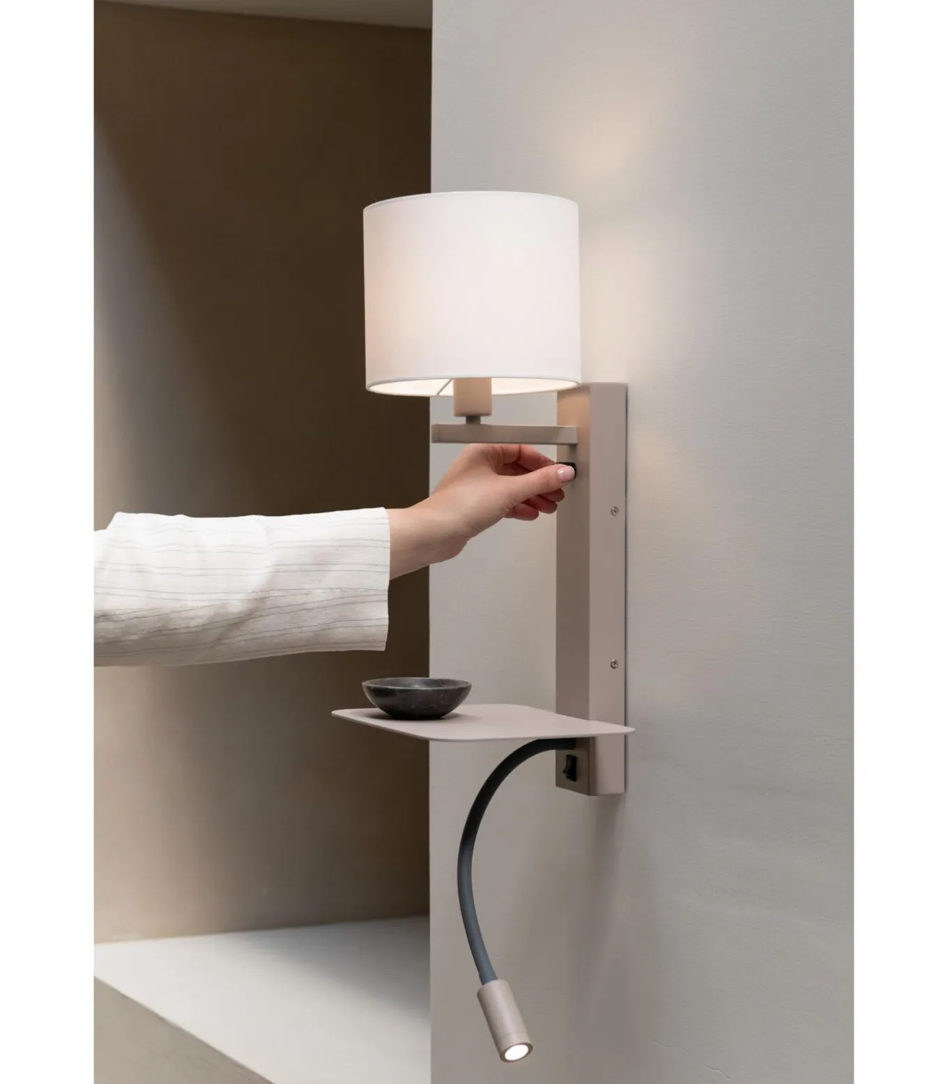 De Florence wandlamp met leeslamp biedt ultieme veelzijdigheid en combineert strak design met slimme functionaliteit. Voorzien van een ingebouwde dimmer, USB–C–poort en een handig plankje voor je essentials, plus een flexibele leeslamp voor gerichte verlichting. Kies uit vier stijlvolle lampenkappen om de lamp perfect af te stemmen op jouw interieur. Een ideale combinatie van comfort, stijl en gebruiksgemak voor het moderne leven.